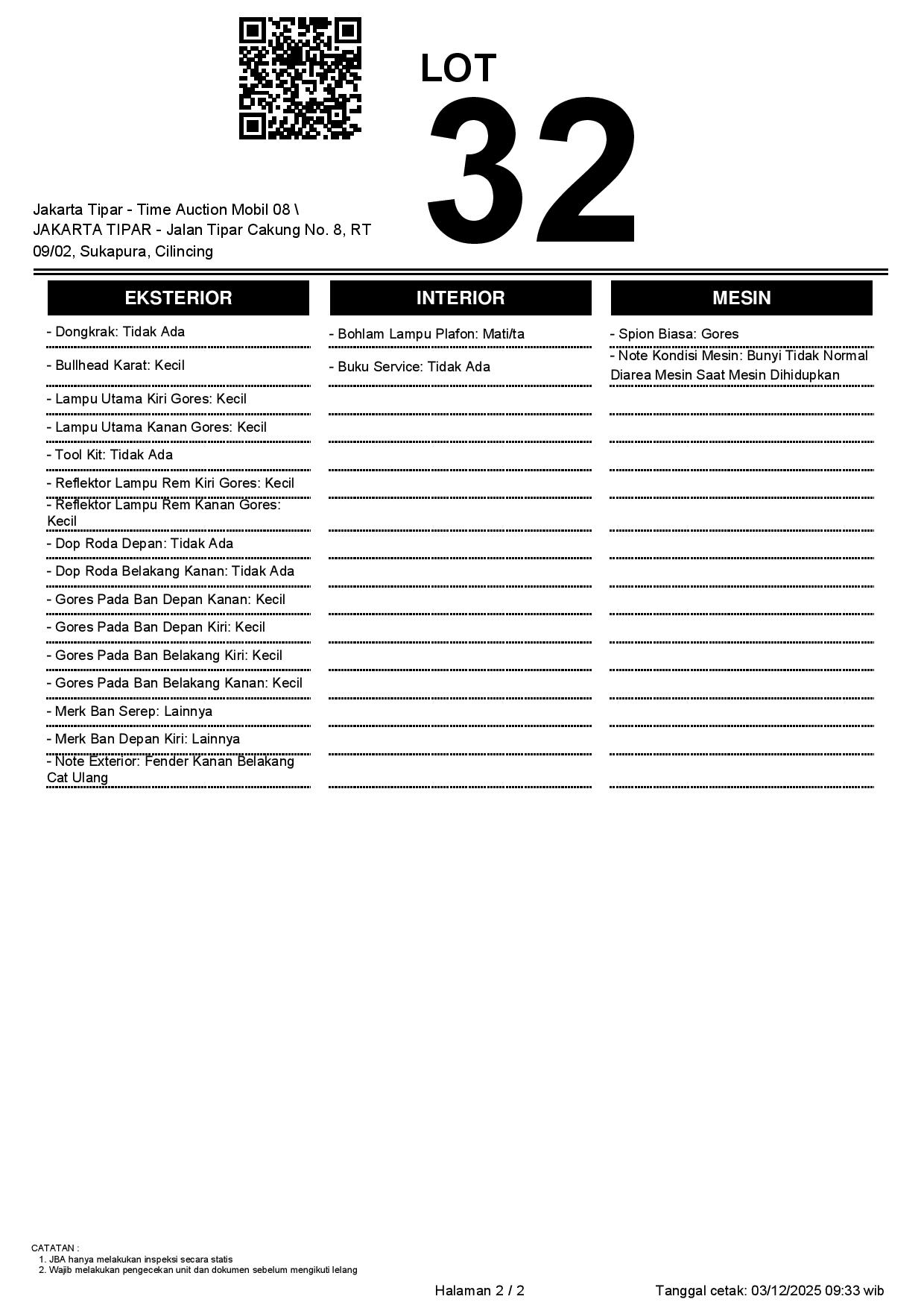 - Kondisi objek lelang dilelang apa adanya, baik kondisi fisik, mesin maupun legalitas kendaraan. Jika terdapat kekurangan/cacat baik yang terlihat maupun yang tidak terlihat, maka semua akan menjadi tanggung jawab/risiko Pemenang Lelang. Oleh karena itu, Pemenang Lelang melepaskan segala hak untuk menuntut dan/atau meminta ganti rugi atas hal tersebut kepada JBA.