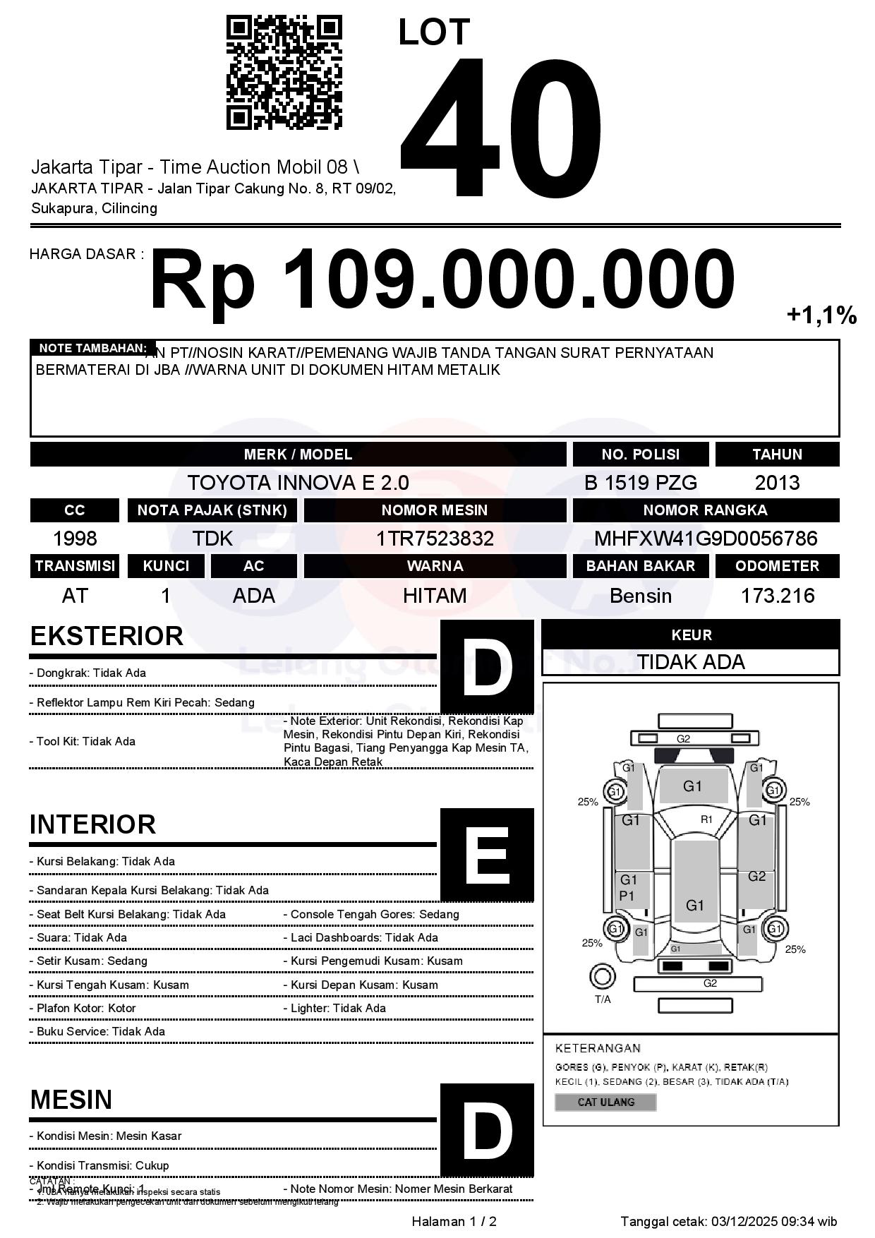 - Kondisi objek lelang dilelang apa adanya, baik kondisi fisik, mesin maupun legalitas kendaraan. Jika terdapat kekurangan/cacat baik yang terlihat maupun yang tidak terlihat, maka semua akan menjadi tanggung jawab/risiko Pemenang Lelang. Oleh karena itu, Pemenang Lelang melepaskan segala hak untuk menuntut dan/atau meminta ganti rugi atas hal tersebut kepada JBA.