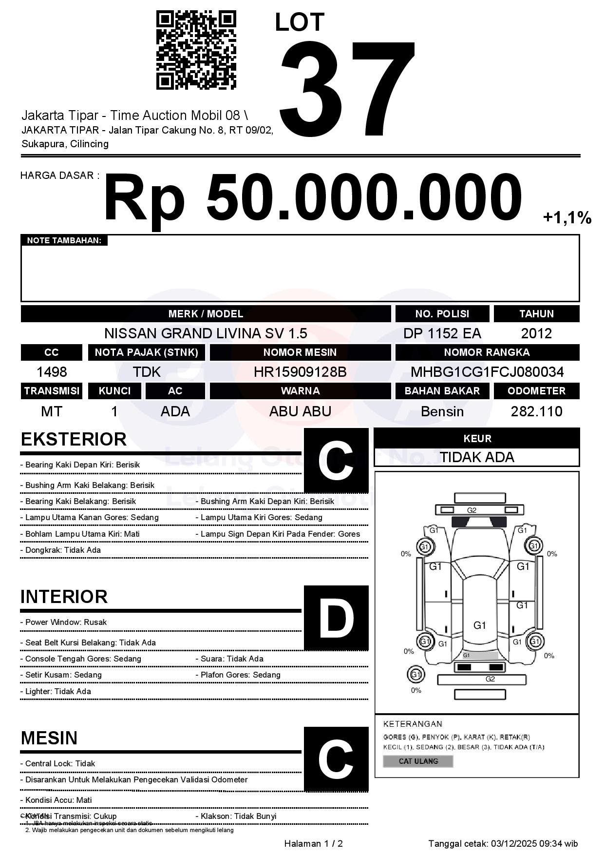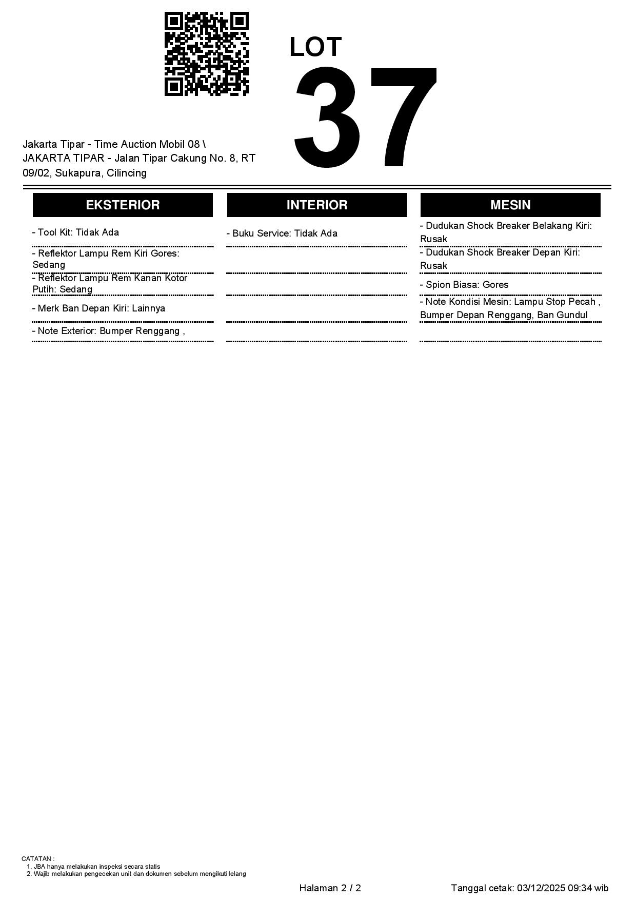 - Kondisi objek lelang dilelang apa adanya, baik kondisi fisik, mesin maupun legalitas kendaraan. Jika terdapat kekurangan/cacat baik yang terlihat maupun yang tidak terlihat, maka semua akan menjadi tanggung jawab/risiko Pemenang Lelang. Oleh karena itu, Pemenang Lelang melepaskan segala hak untuk menuntut dan/atau meminta ganti rugi atas hal tersebut kepada JBA.