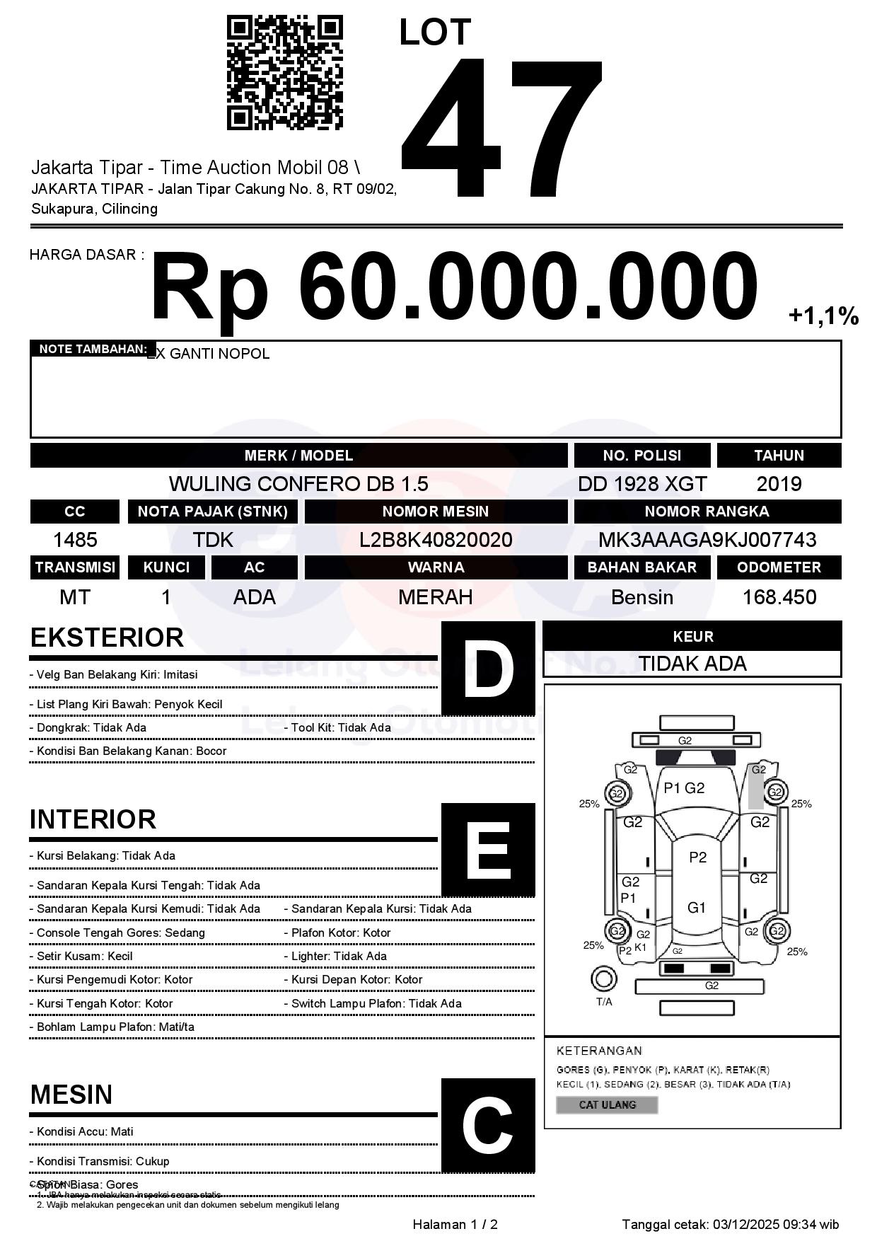 - Kondisi objek lelang dilelang apa adanya, baik kondisi fisik, mesin maupun legalitas kendaraan. Jika terdapat kekurangan/cacat baik yang terlihat maupun yang tidak terlihat, maka semua akan menjadi tanggung jawab/risiko Pemenang Lelang. Oleh karena itu, Pemenang Lelang melepaskan segala hak untuk menuntut dan/atau meminta ganti rugi atas hal tersebut kepada JBA.