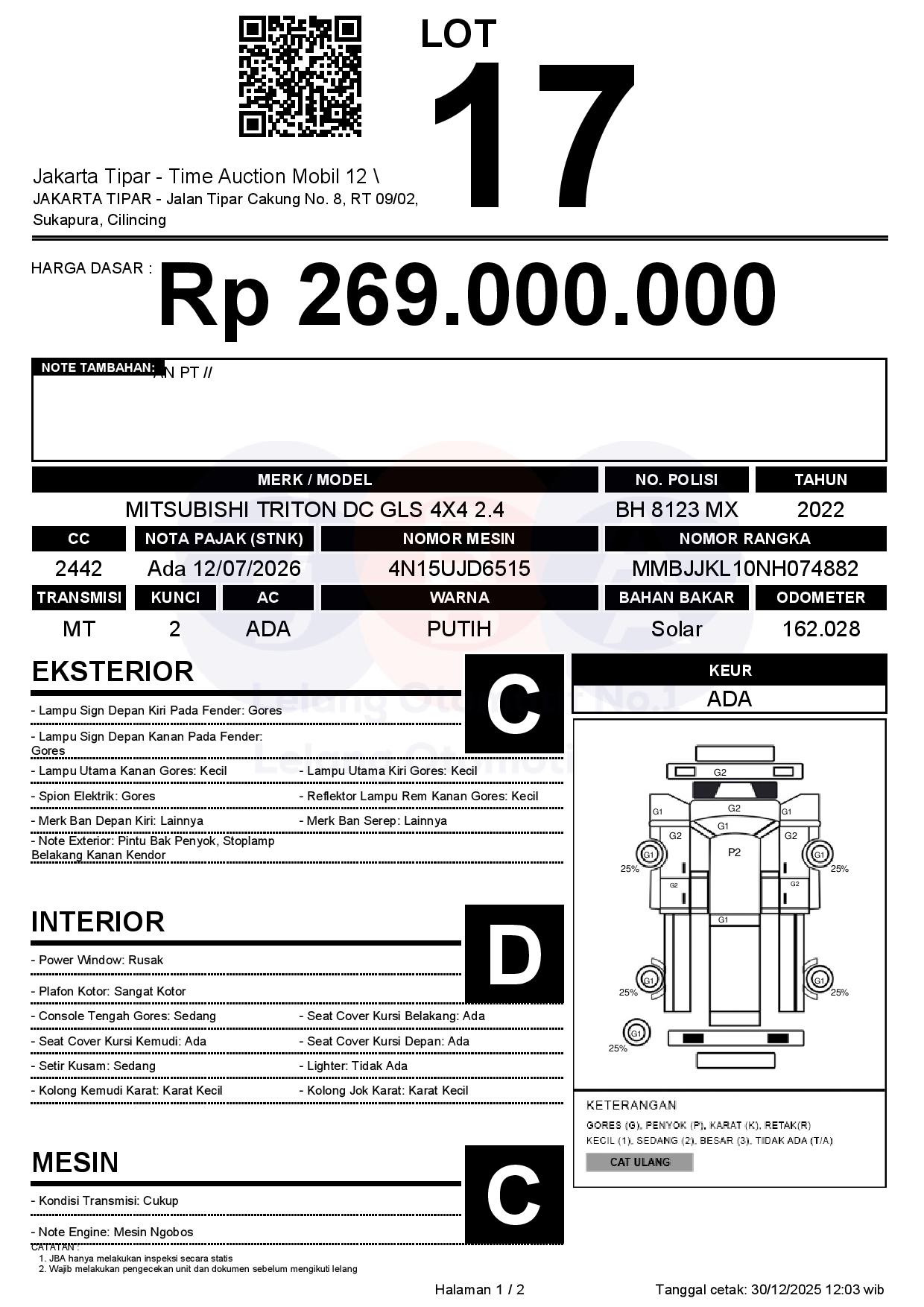 - Kondisi objek lelang dilelang apa adanya, baik kondisi fisik, mesin maupun legalitas kendaraan. Jika terdapat kekurangan/cacat baik yang terlihat maupun yang tidak terlihat, maka semua akan menjadi tanggung jawab/risiko Pemenang Lelang. Oleh karena itu, Pemenang Lelang melepaskan segala hak untuk menuntut dan/atau meminta ganti rugi atas hal tersebut kepada JBA.