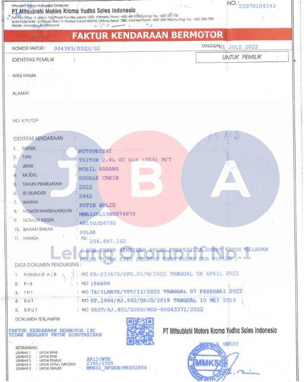 - Kondisi objek lelang dilelang apa adanya, baik kondisi fisik, mesin maupun legalitas kendaraan. Jika terdapat kekurangan/cacat baik yang terlihat maupun yang tidak terlihat, maka semua akan menjadi tanggung jawab/risiko Pemenang Lelang. Oleh karena itu, Pemenang Lelang melepaskan segala hak untuk menuntut dan/atau meminta ganti rugi atas hal tersebut kepada JBA.
