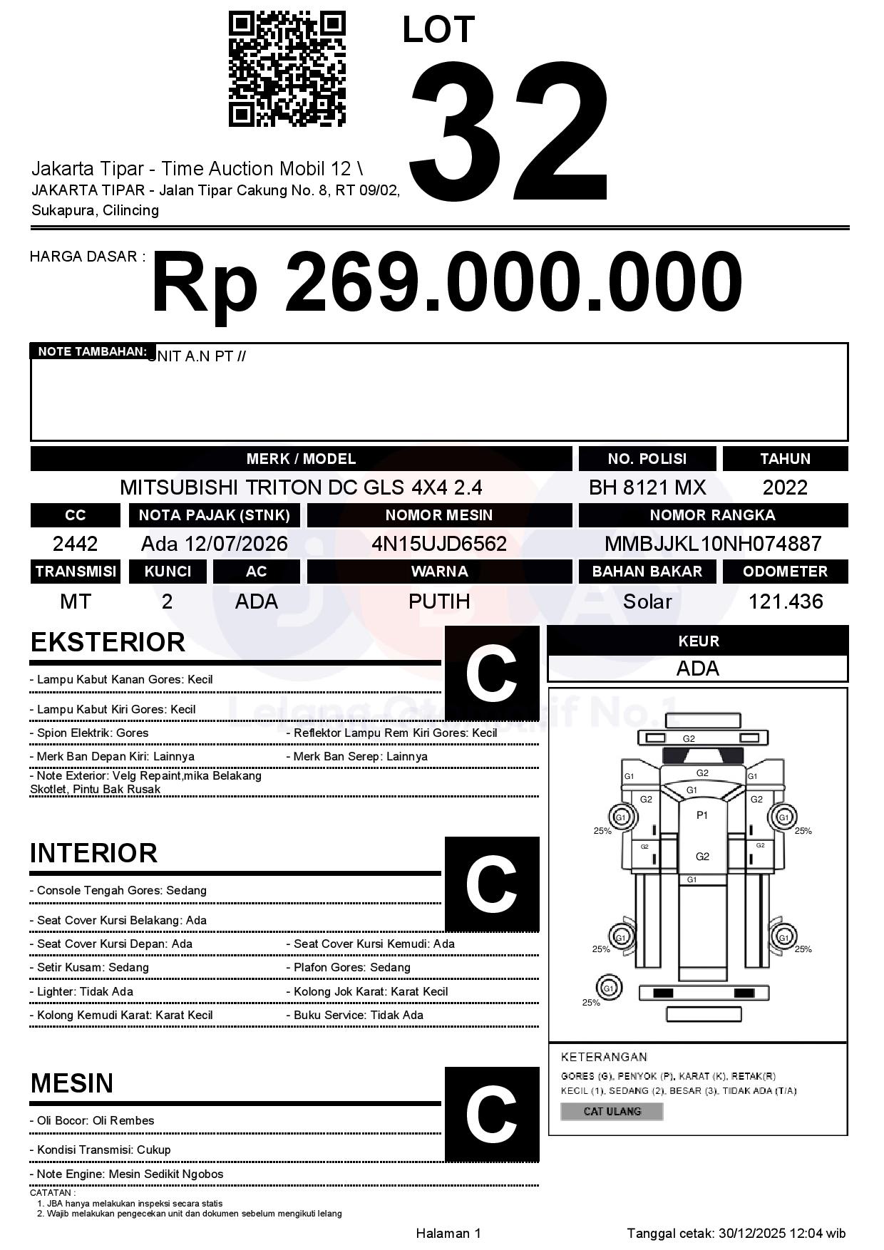 - Kondisi objek lelang dilelang apa adanya, baik kondisi fisik, mesin maupun legalitas kendaraan. Jika terdapat kekurangan/cacat baik yang terlihat maupun yang tidak terlihat, maka semua akan menjadi tanggung jawab/risiko Pemenang Lelang. Oleh karena itu, Pemenang Lelang melepaskan segala hak untuk menuntut dan/atau meminta ganti rugi atas hal tersebut kepada JBA.