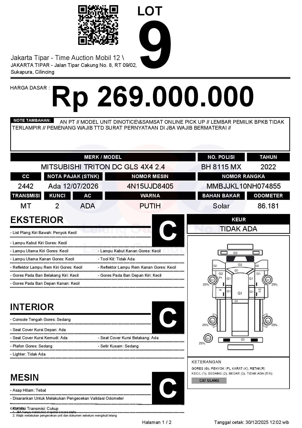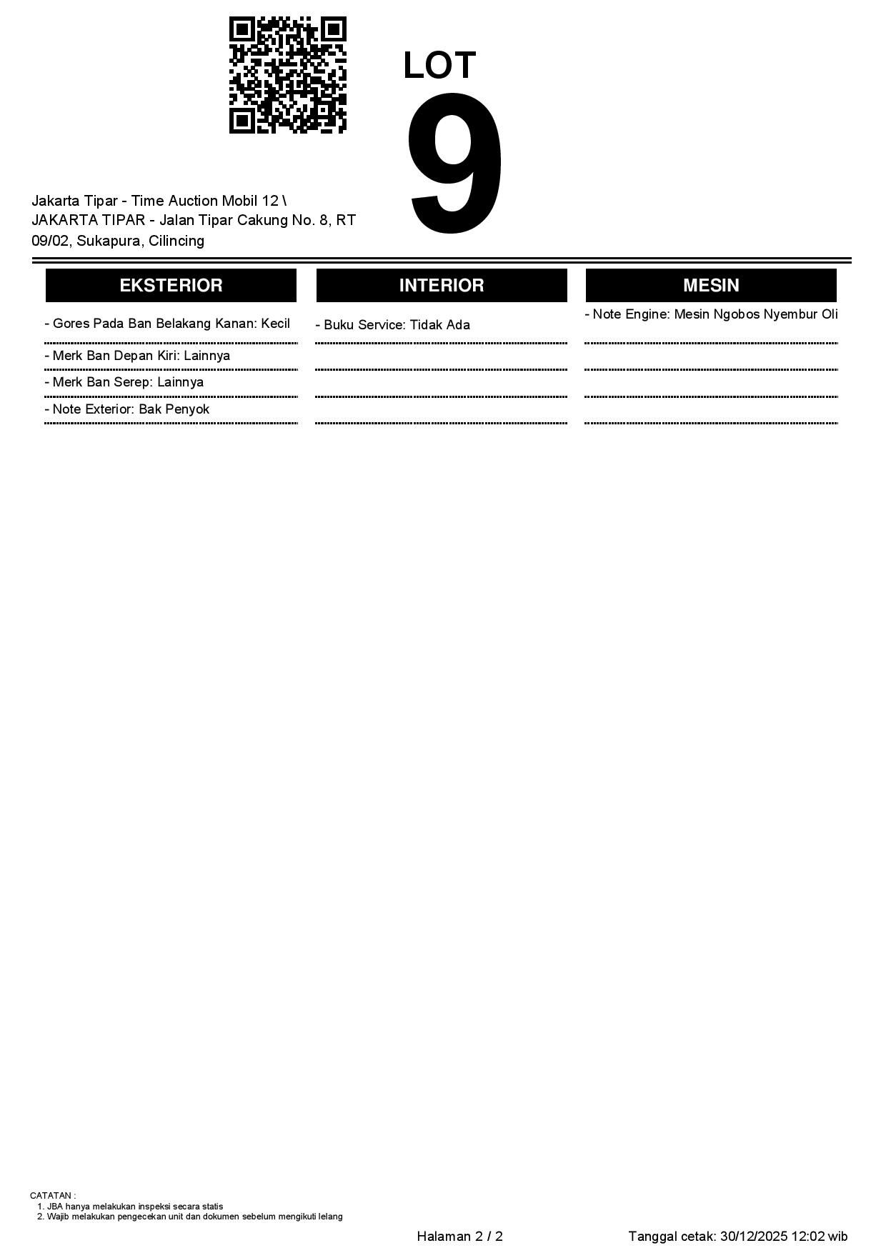 - Kondisi objek lelang dilelang apa adanya, baik kondisi fisik, mesin maupun legalitas kendaraan. Jika terdapat kekurangan/cacat baik yang terlihat maupun yang tidak terlihat, maka semua akan menjadi tanggung jawab/risiko Pemenang Lelang. Oleh karena itu, Pemenang Lelang melepaskan segala hak untuk menuntut dan/atau meminta ganti rugi atas hal tersebut kepada JBA.