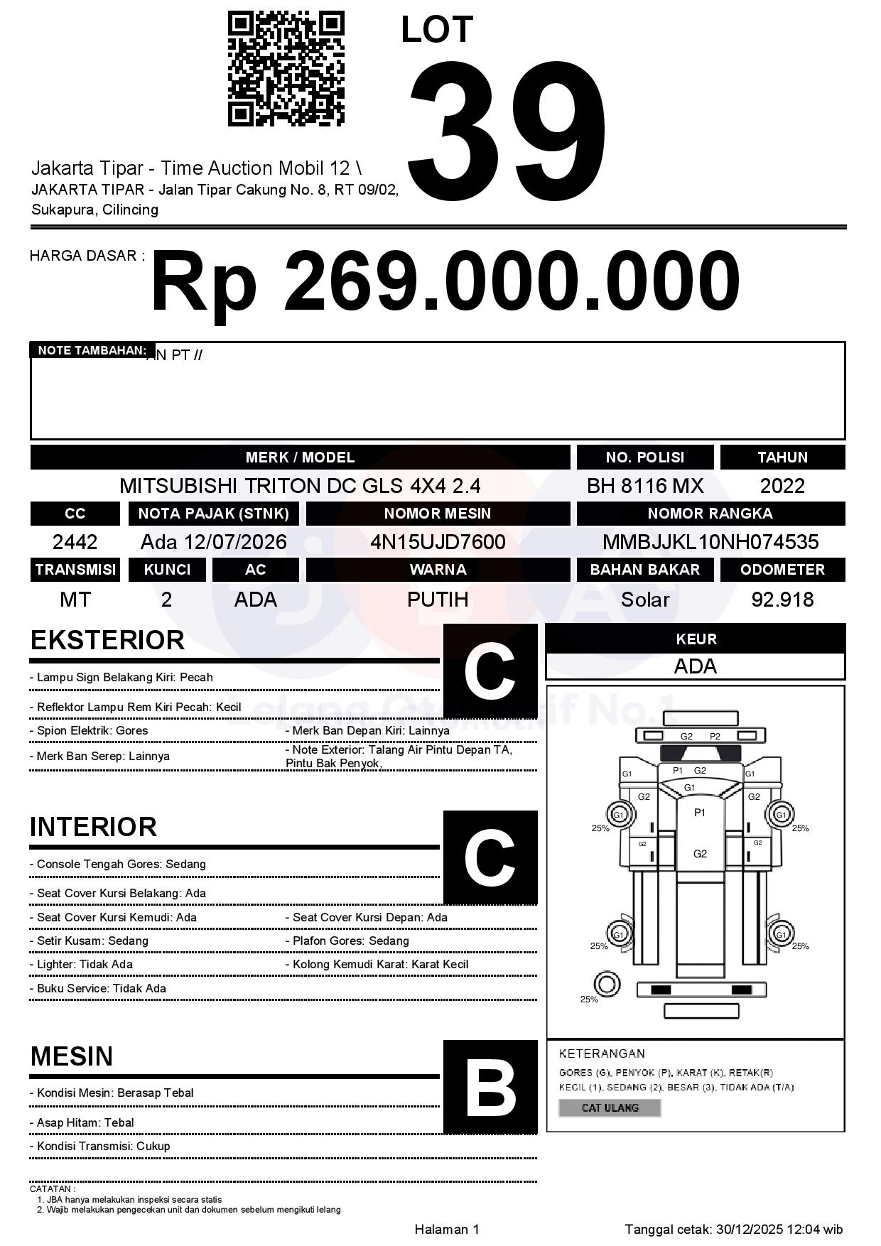 - Kondisi objek lelang dilelang apa adanya, baik kondisi fisik, mesin maupun legalitas kendaraan. Jika terdapat kekurangan/cacat baik yang terlihat maupun yang tidak terlihat, maka semua akan menjadi tanggung jawab/risiko Pemenang Lelang. Oleh karena itu, Pemenang Lelang melepaskan segala hak untuk menuntut dan/atau meminta ganti rugi atas hal tersebut kepada JBA.