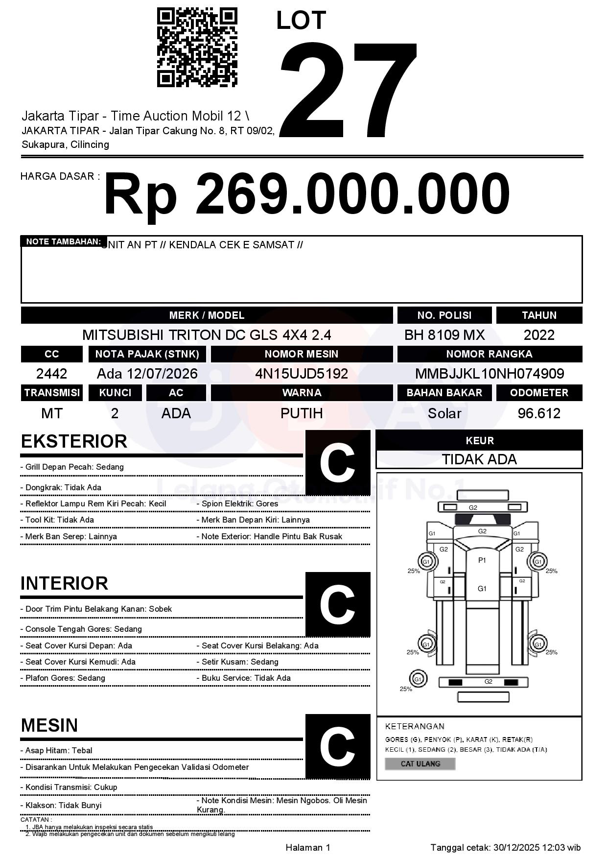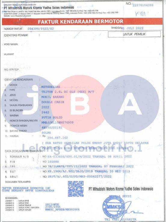 - Kondisi objek lelang dilelang apa adanya, baik kondisi fisik, mesin maupun legalitas kendaraan. Jika terdapat kekurangan/cacat baik yang terlihat maupun yang tidak terlihat, maka semua akan menjadi tanggung jawab/risiko Pemenang Lelang. Oleh karena itu, Pemenang Lelang melepaskan segala hak untuk menuntut dan/atau meminta ganti rugi atas hal tersebut kepada JBA.