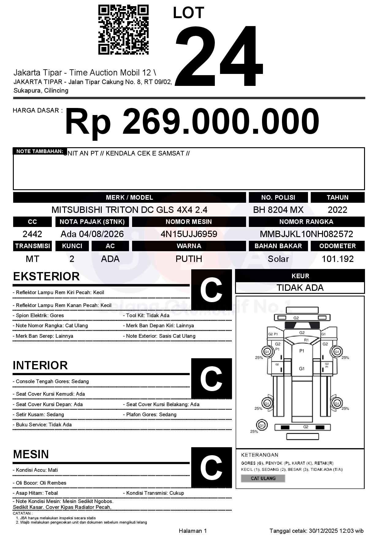 - Kondisi objek lelang dilelang apa adanya, baik kondisi fisik, mesin maupun legalitas kendaraan. Jika terdapat kekurangan/cacat baik yang terlihat maupun yang tidak terlihat, maka semua akan menjadi tanggung jawab/risiko Pemenang Lelang. Oleh karena itu, Pemenang Lelang melepaskan segala hak untuk menuntut dan/atau meminta ganti rugi atas hal tersebut kepada JBA.