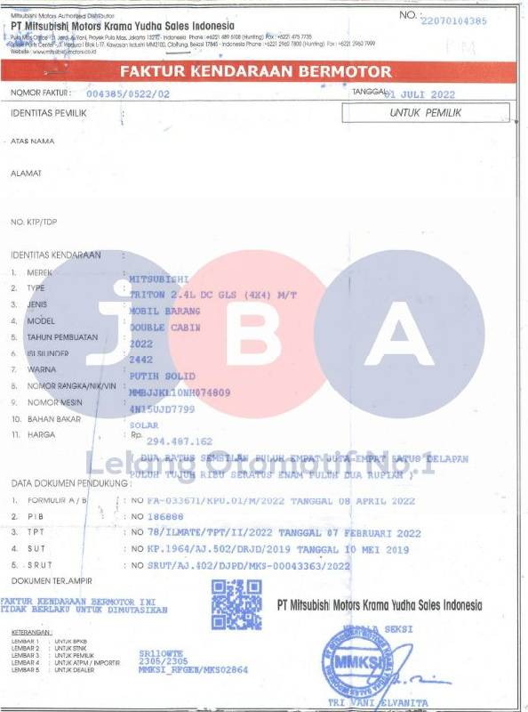 - Atas Nama : PT JBA INDONESIA