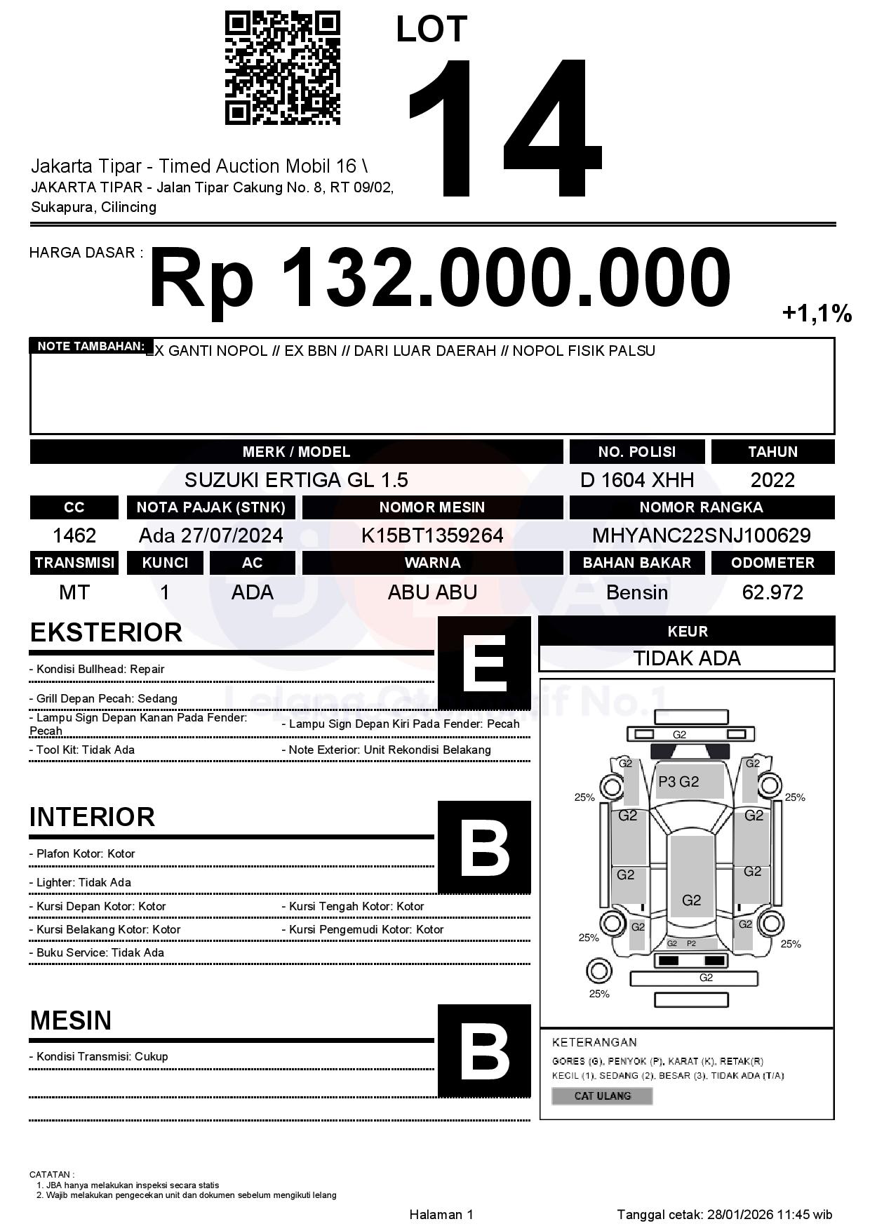 - Kondisi objek lelang dilelang apa adanya, baik kondisi fisik, mesin maupun legalitas kendaraan. Jika terdapat kekurangan/cacat baik yang terlihat maupun yang tidak terlihat, maka semua akan menjadi tanggung jawab/risiko Pemenang Lelang. Oleh karena itu, Pemenang Lelang melepaskan segala hak untuk menuntut dan/atau meminta ganti rugi atas hal tersebut kepada JBA.