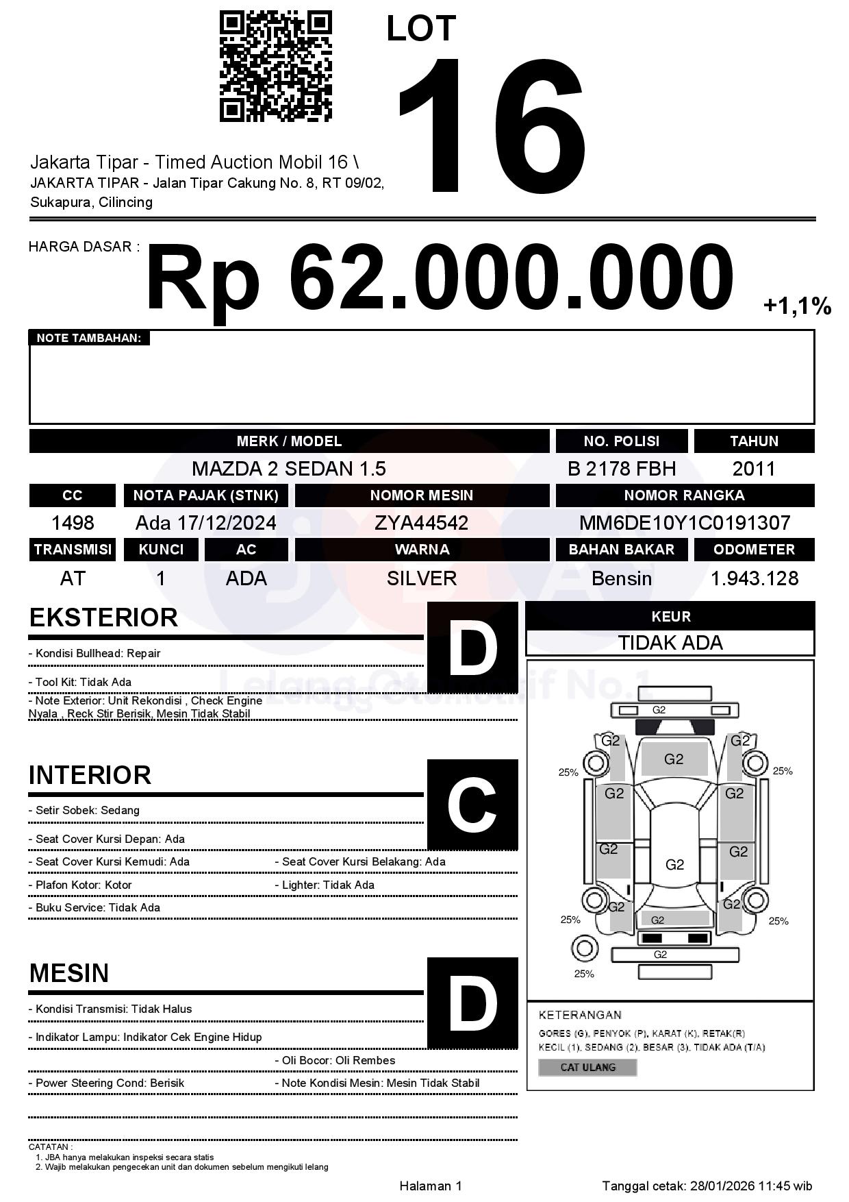- Kondisi objek lelang dilelang apa adanya, baik kondisi fisik, mesin maupun legalitas kendaraan. Jika terdapat kekurangan/cacat baik yang terlihat maupun yang tidak terlihat, maka semua akan menjadi tanggung jawab/risiko Pemenang Lelang. Oleh karena itu, Pemenang Lelang melepaskan segala hak untuk menuntut dan/atau meminta ganti rugi atas hal tersebut kepada JBA.
