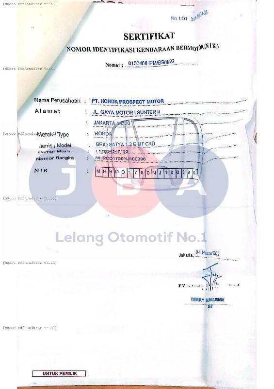 - Dokumen kepemilikan akan diserahkan kepada Pemenang Lelang sesuai dengan jadwal yang tercantum dalam katalog objek lelang, dan Berita Acara Pemenang Lelang (BAPL) akan diberikan oleh JBA kepada Pemenang Lelang setelah pembayaran harga terbentuk atau pada saat pengambilan unit objek lelang.