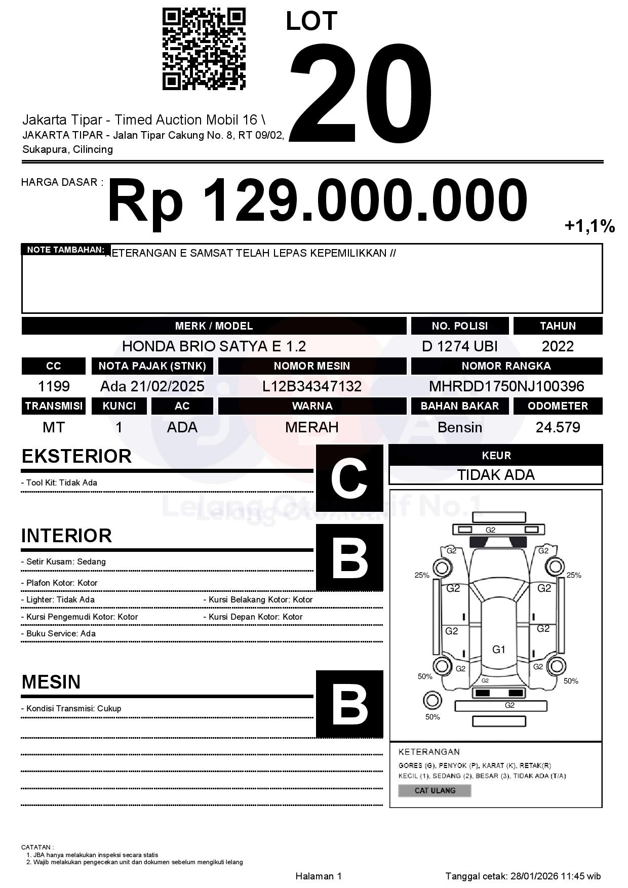 - Kondisi objek lelang dilelang apa adanya, baik kondisi fisik, mesin maupun legalitas kendaraan. Jika terdapat kekurangan/cacat baik yang terlihat maupun yang tidak terlihat, maka semua akan menjadi tanggung jawab/risiko Pemenang Lelang. Oleh karena itu, Pemenang Lelang melepaskan segala hak untuk menuntut dan/atau meminta ganti rugi atas hal tersebut kepada JBA.