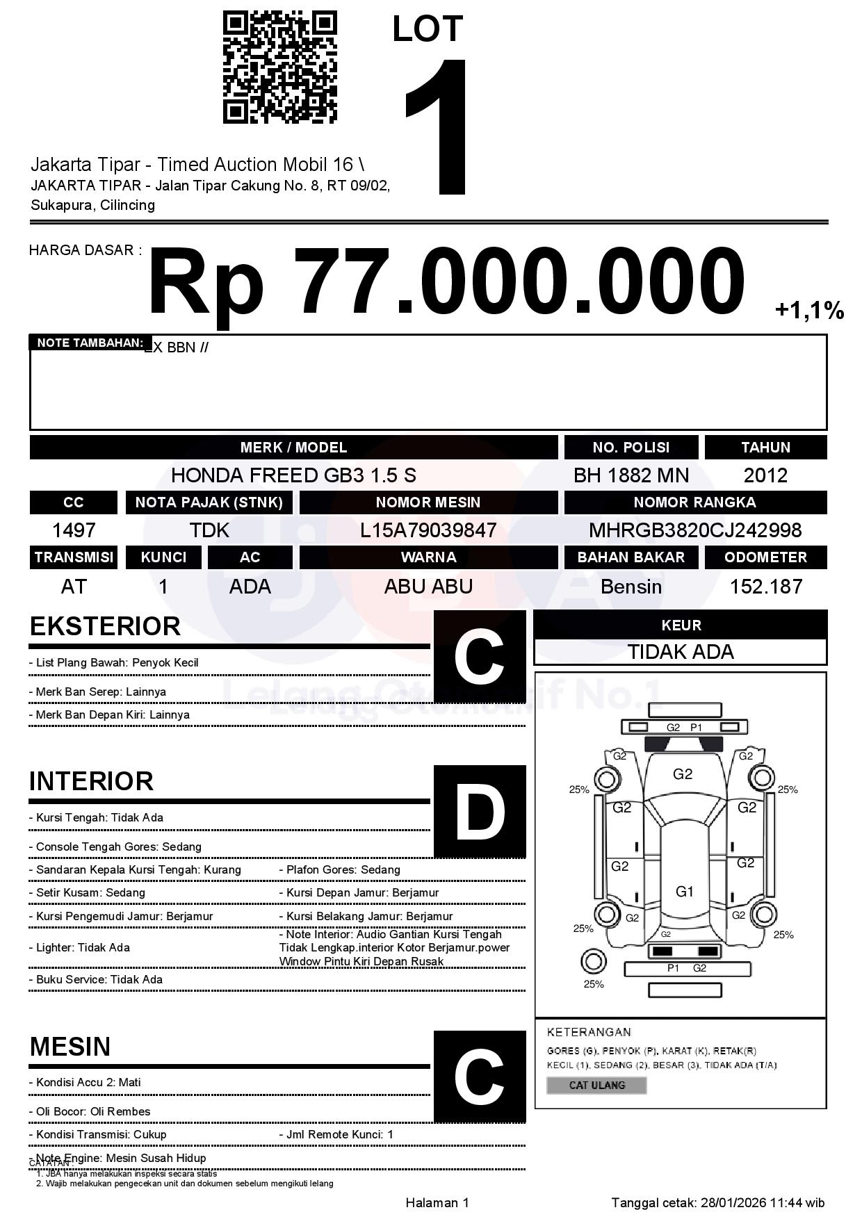 - Kondisi objek lelang dilelang apa adanya, baik kondisi fisik, mesin maupun legalitas kendaraan. Jika terdapat kekurangan/cacat baik yang terlihat maupun yang tidak terlihat, maka semua akan menjadi tanggung jawab/risiko Pemenang Lelang. Oleh karena itu, Pemenang Lelang melepaskan segala hak untuk menuntut dan/atau meminta ganti rugi atas hal tersebut kepada JBA.