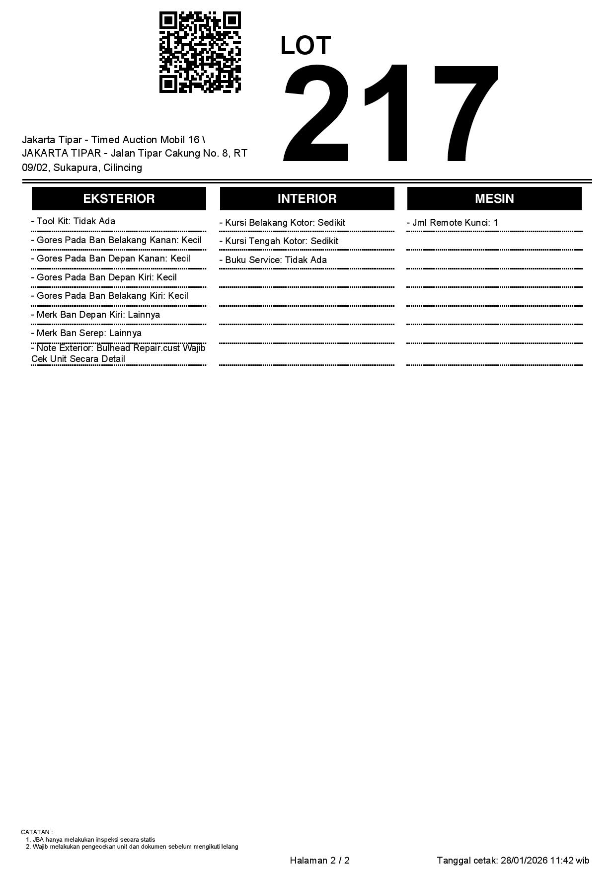 - Kondisi objek lelang dilelang apa adanya, baik kondisi fisik, mesin maupun legalitas kendaraan. Jika terdapat kekurangan/cacat baik yang terlihat maupun yang tidak terlihat, maka semua akan menjadi tanggung jawab/risiko Pemenang Lelang. Oleh karena itu, Pemenang Lelang melepaskan segala hak untuk menuntut dan/atau meminta ganti rugi atas hal tersebut kepada JBA.