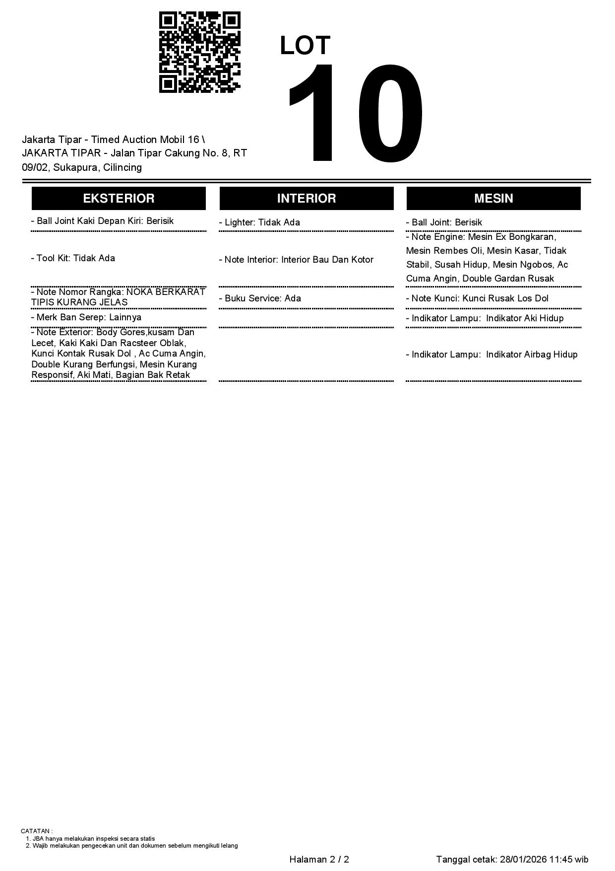 - Kondisi objek lelang dilelang apa adanya, baik kondisi fisik, mesin maupun legalitas kendaraan. Jika terdapat kekurangan/cacat baik yang terlihat maupun yang tidak terlihat, maka semua akan menjadi tanggung jawab/risiko Pemenang Lelang. Oleh karena itu, Pemenang Lelang melepaskan segala hak untuk menuntut dan/atau meminta ganti rugi atas hal tersebut kepada JBA.