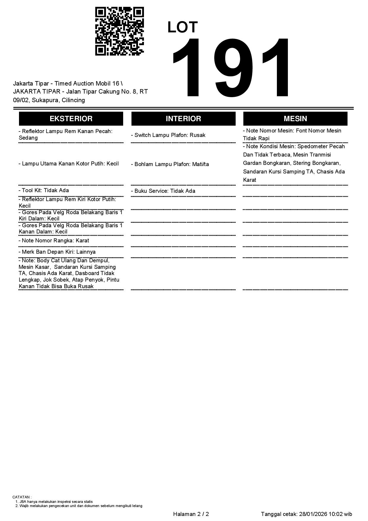 - Kondisi objek lelang dilelang apa adanya, baik kondisi fisik, mesin maupun legalitas kendaraan. Jika terdapat kekurangan/cacat baik yang terlihat maupun yang tidak terlihat, maka semua akan menjadi tanggung jawab/risiko Pemenang Lelang. Oleh karena itu, Pemenang Lelang melepaskan segala hak untuk menuntut dan/atau meminta ganti rugi atas hal tersebut kepada JBA.