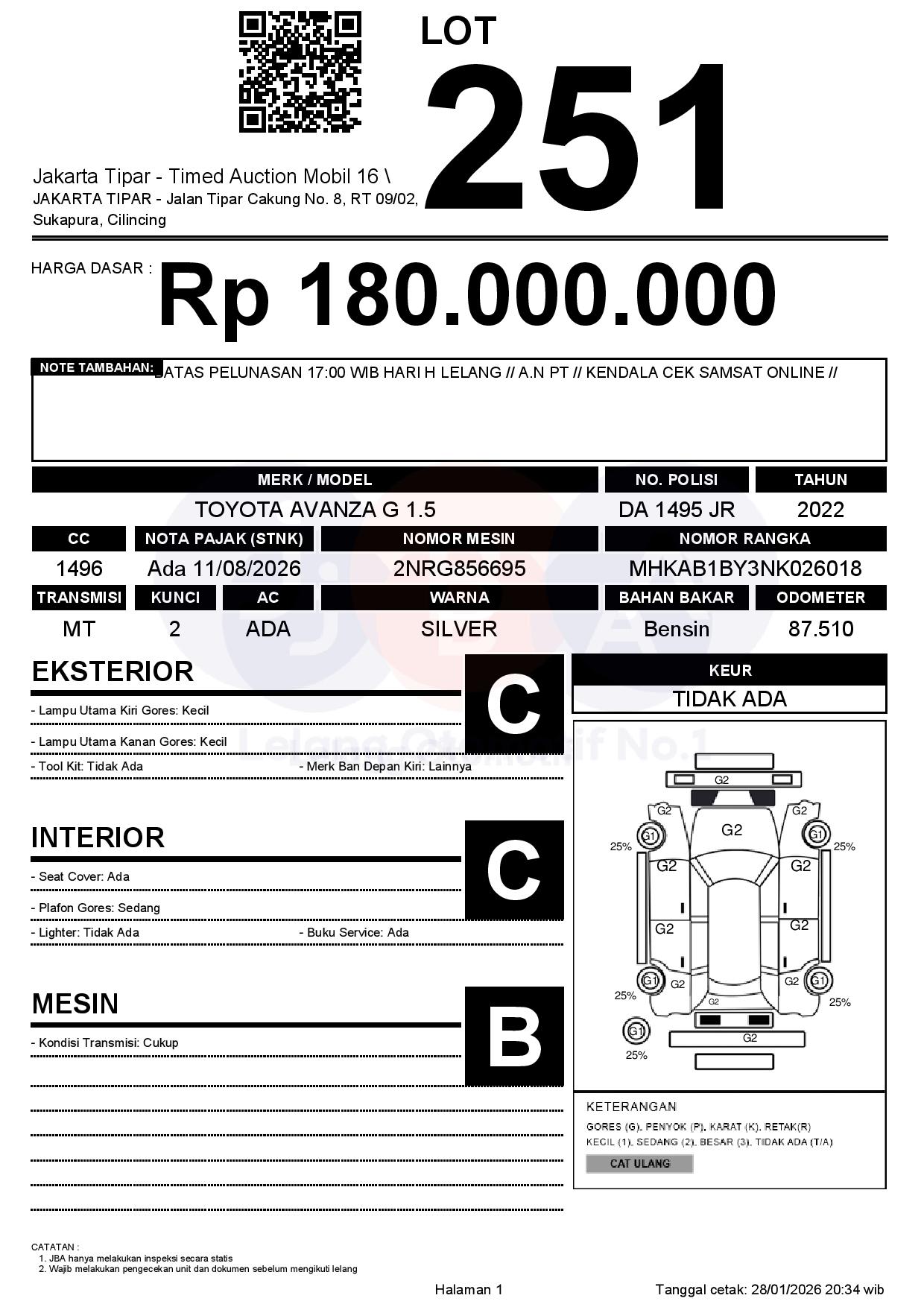 - Kondisi objek lelang dilelang apa adanya, baik kondisi fisik, mesin maupun legalitas kendaraan. Jika terdapat kekurangan/cacat baik yang terlihat maupun yang tidak terlihat, maka semua akan menjadi tanggung jawab/risiko Pemenang Lelang. Oleh karena itu, Pemenang Lelang melepaskan segala hak untuk menuntut dan/atau meminta ganti rugi atas hal tersebut kepada JBA.