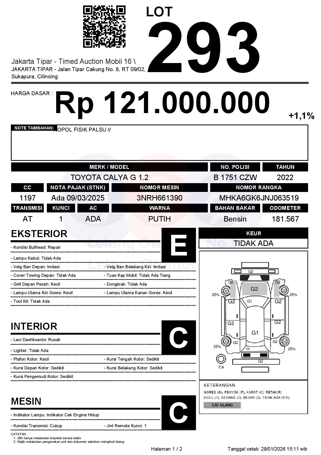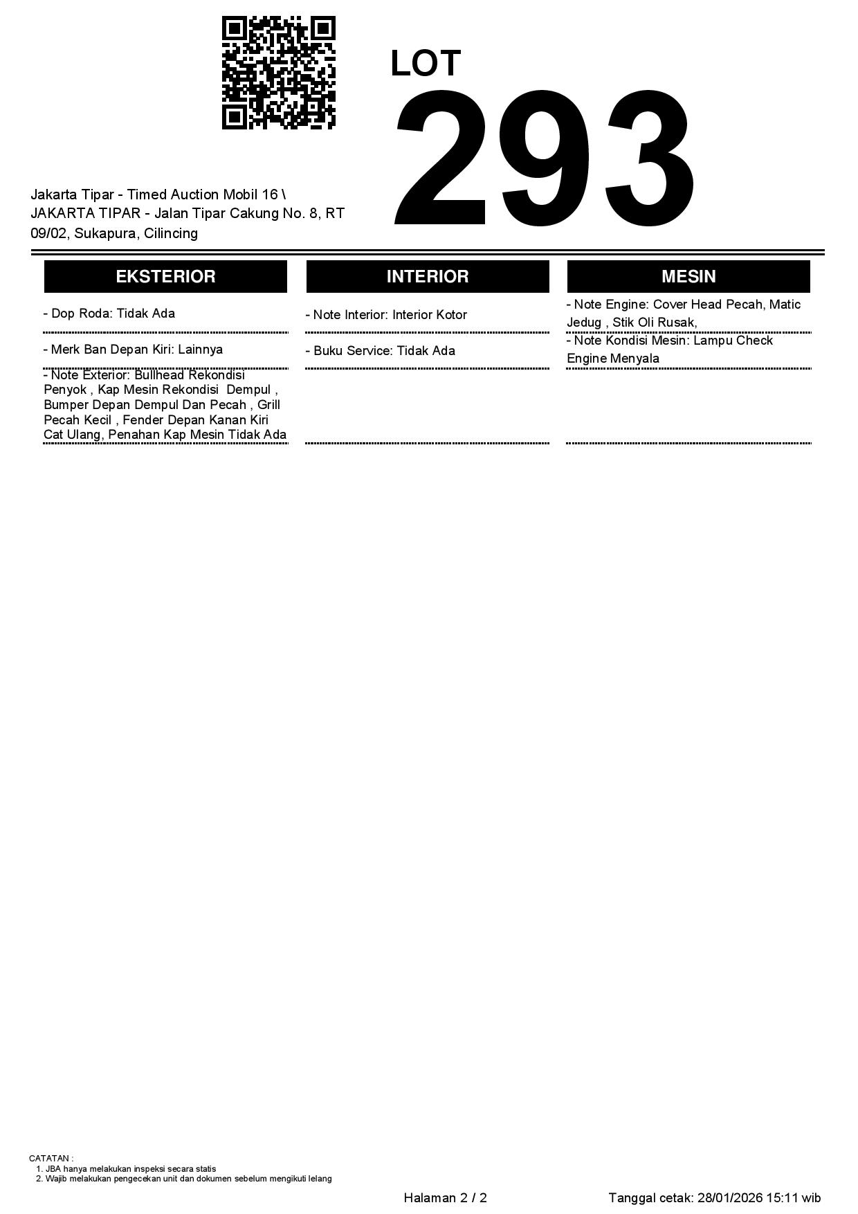 - Kondisi objek lelang dilelang apa adanya, baik kondisi fisik, mesin maupun legalitas kendaraan. Jika terdapat kekurangan/cacat baik yang terlihat maupun yang tidak terlihat, maka semua akan menjadi tanggung jawab/risiko Pemenang Lelang. Oleh karena itu, Pemenang Lelang melepaskan segala hak untuk menuntut dan/atau meminta ganti rugi atas hal tersebut kepada JBA.