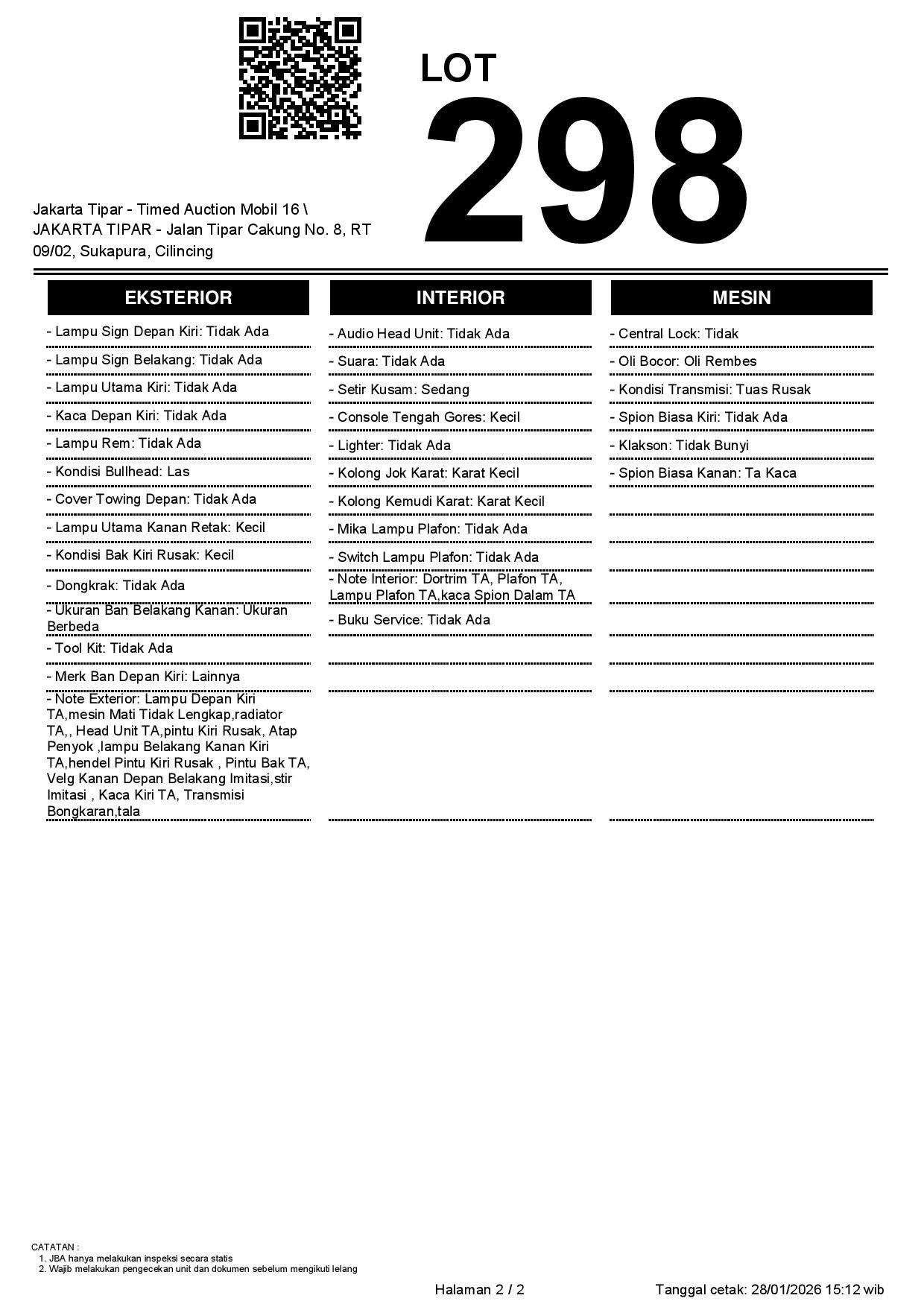- Kondisi objek lelang dilelang apa adanya, baik kondisi fisik, mesin maupun legalitas kendaraan. Jika terdapat kekurangan/cacat baik yang terlihat maupun yang tidak terlihat, maka semua akan menjadi tanggung jawab/risiko Pemenang Lelang. Oleh karena itu, Pemenang Lelang melepaskan segala hak untuk menuntut dan/atau meminta ganti rugi atas hal tersebut kepada JBA.