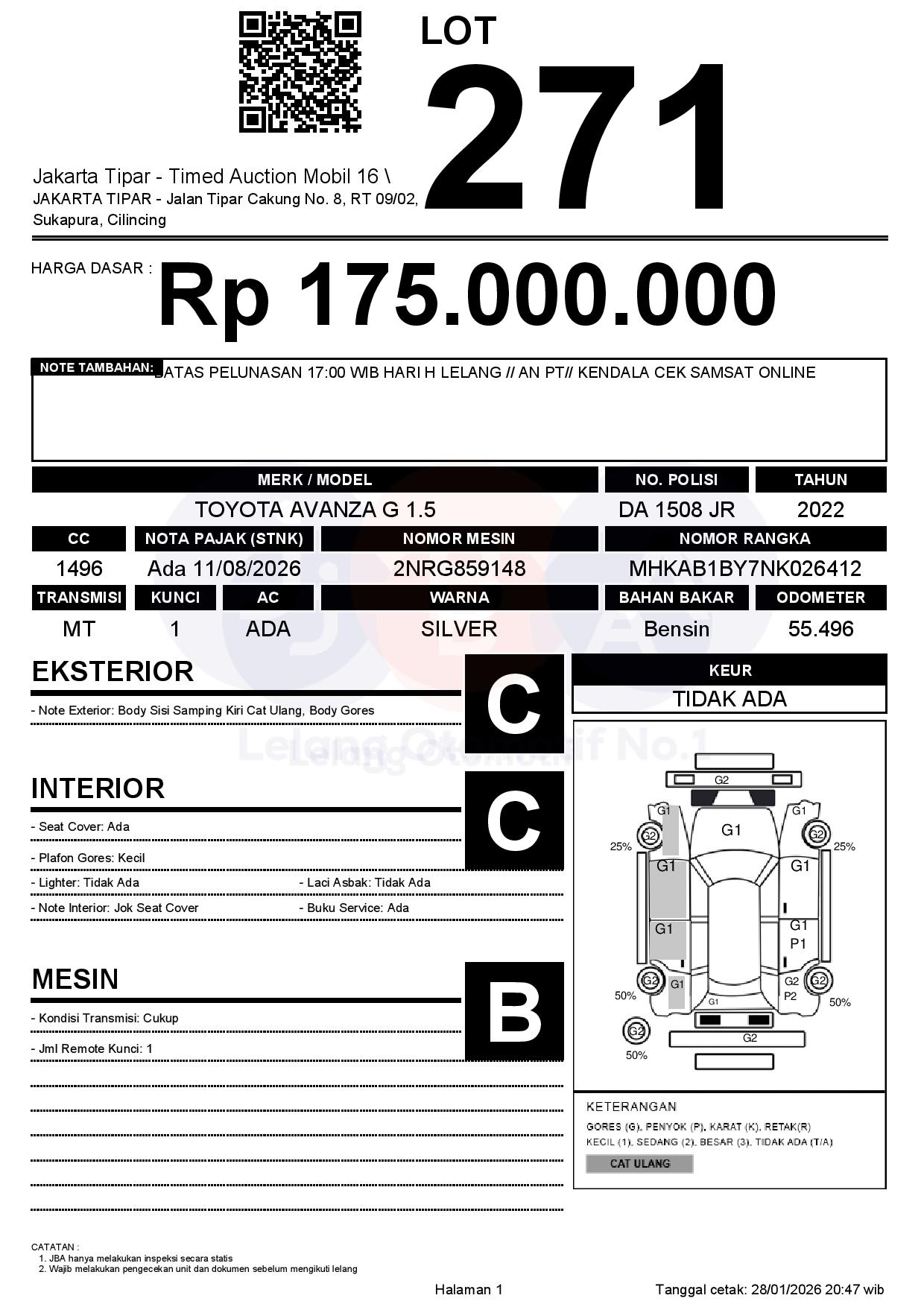 - Kondisi objek lelang dilelang apa adanya, baik kondisi fisik, mesin maupun legalitas kendaraan. Jika terdapat kekurangan/cacat baik yang terlihat maupun yang tidak terlihat, maka semua akan menjadi tanggung jawab/risiko Pemenang Lelang. Oleh karena itu, Pemenang Lelang melepaskan segala hak untuk menuntut dan/atau meminta ganti rugi atas hal tersebut kepada JBA.