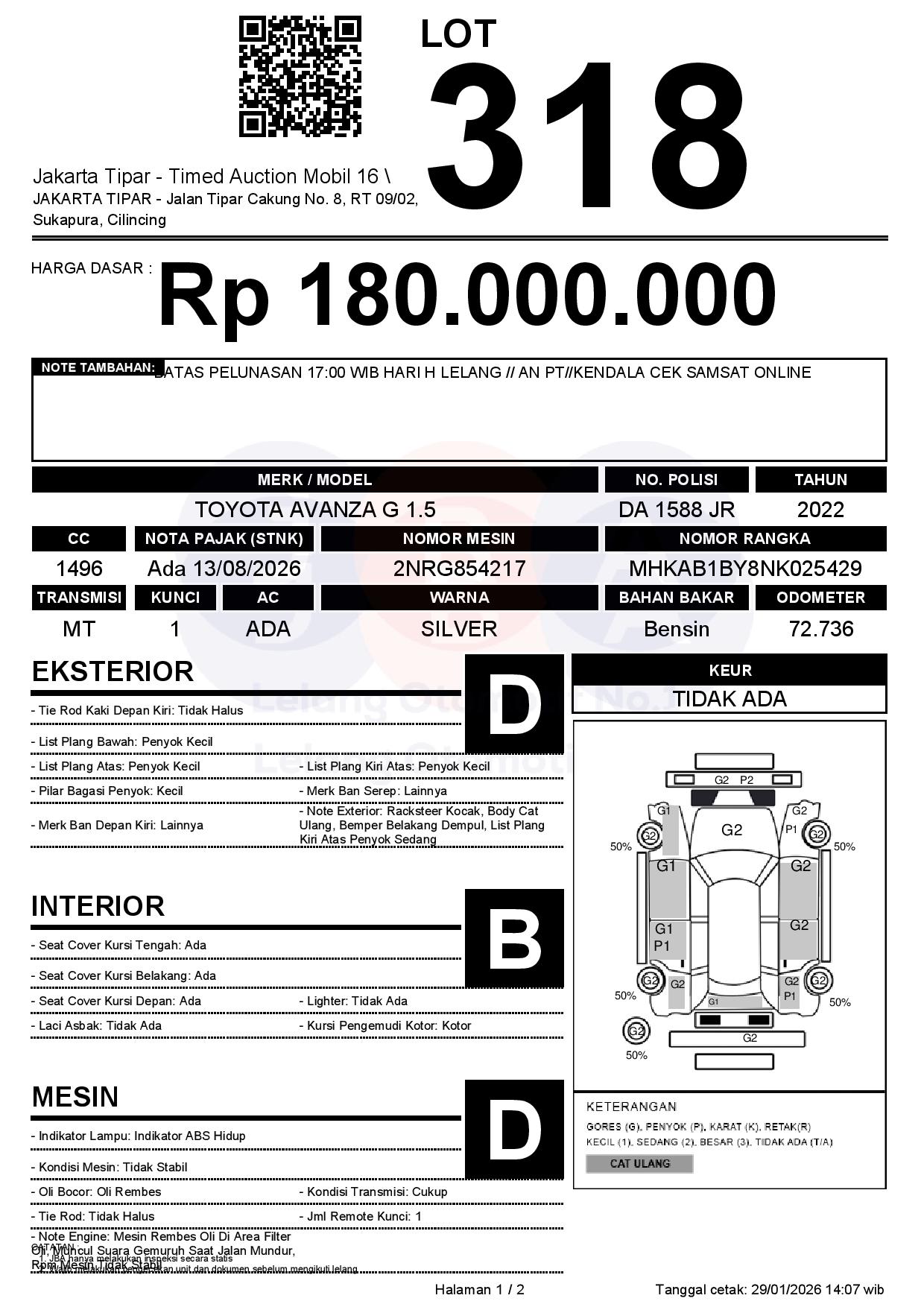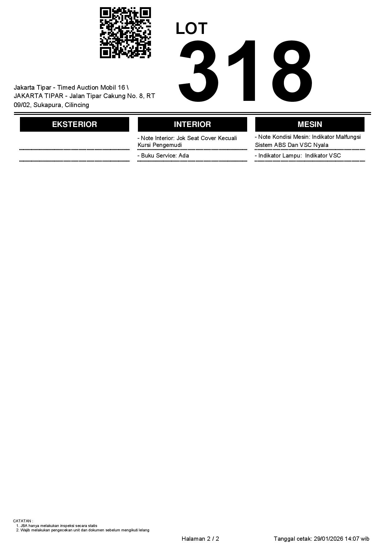 - Kondisi objek lelang dilelang apa adanya, baik kondisi fisik, mesin maupun legalitas kendaraan. Jika terdapat kekurangan/cacat baik yang terlihat maupun yang tidak terlihat, maka semua akan menjadi tanggung jawab/risiko Pemenang Lelang. Oleh karena itu, Pemenang Lelang melepaskan segala hak untuk menuntut dan/atau meminta ganti rugi atas hal tersebut kepada JBA.