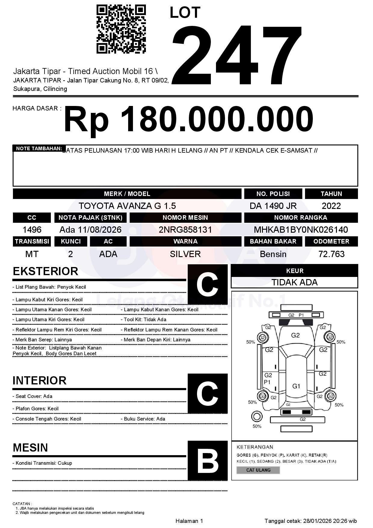 - Kondisi objek lelang dilelang apa adanya, baik kondisi fisik, mesin maupun legalitas kendaraan. Jika terdapat kekurangan/cacat baik yang terlihat maupun yang tidak terlihat, maka semua akan menjadi tanggung jawab/risiko Pemenang Lelang. Oleh karena itu, Pemenang Lelang melepaskan segala hak untuk menuntut dan/atau meminta ganti rugi atas hal tersebut kepada JBA.