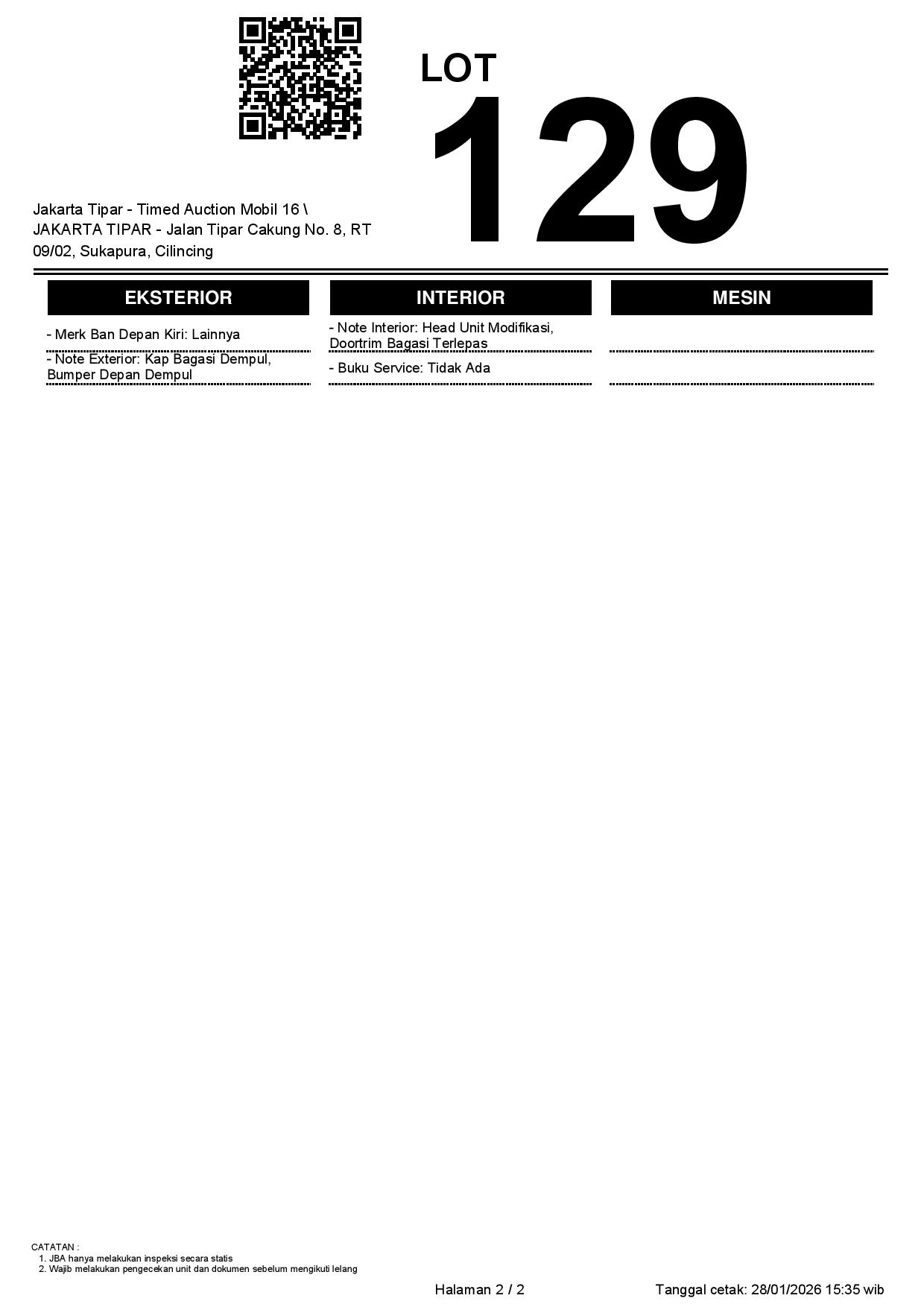- Kondisi objek lelang dilelang apa adanya, baik kondisi fisik, mesin maupun legalitas kendaraan. Jika terdapat kekurangan/cacat baik yang terlihat maupun yang tidak terlihat, maka semua akan menjadi tanggung jawab/risiko Pemenang Lelang. Oleh karena itu, Pemenang Lelang melepaskan segala hak untuk menuntut dan/atau meminta ganti rugi atas hal tersebut kepada JBA.