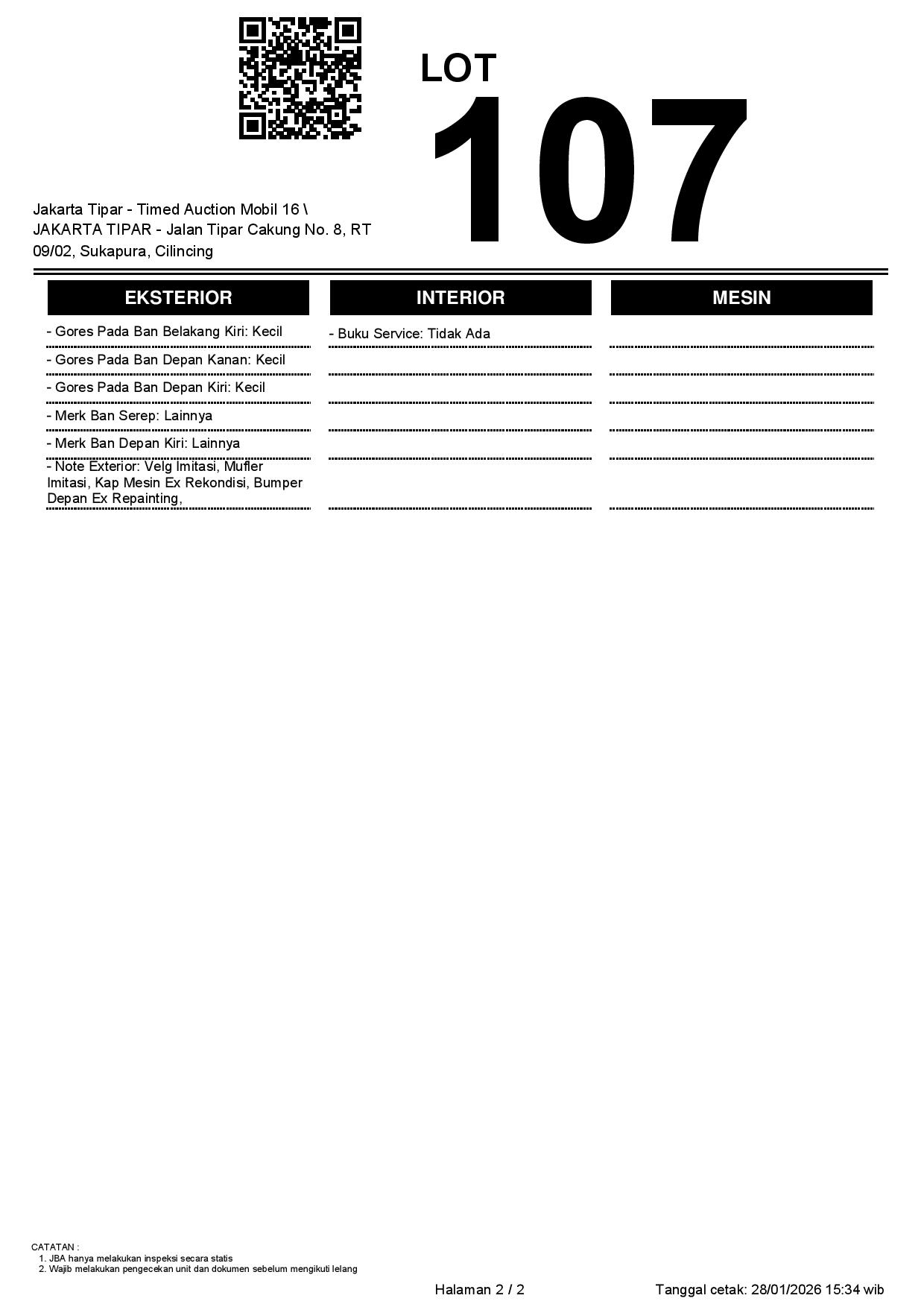 - Kondisi objek lelang dilelang apa adanya, baik kondisi fisik, mesin maupun legalitas kendaraan. Jika terdapat kekurangan/cacat baik yang terlihat maupun yang tidak terlihat, maka semua akan menjadi tanggung jawab/risiko Pemenang Lelang. Oleh karena itu, Pemenang Lelang melepaskan segala hak untuk menuntut dan/atau meminta ganti rugi atas hal tersebut kepada JBA.