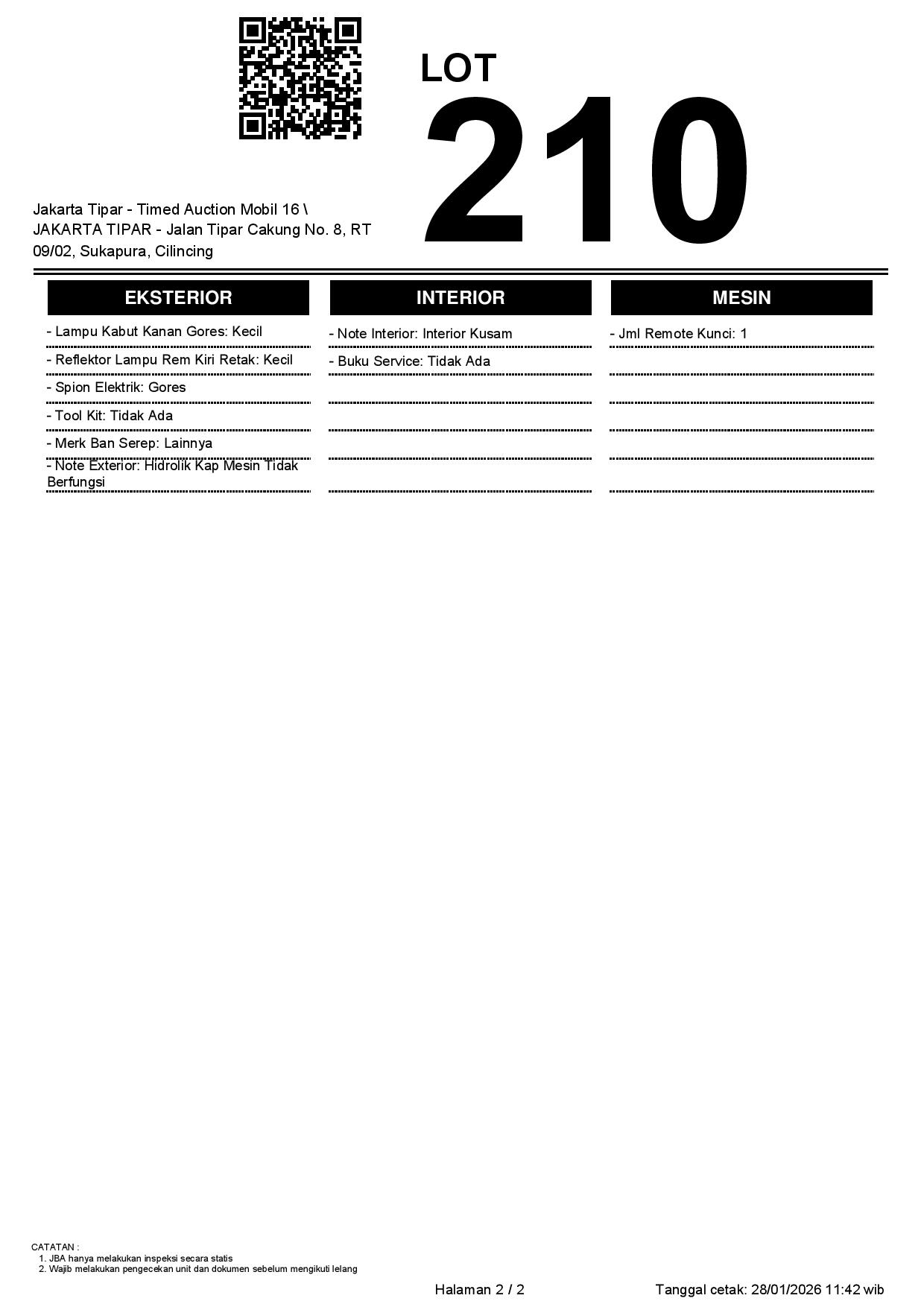 - Kondisi objek lelang dilelang apa adanya, baik kondisi fisik, mesin maupun legalitas kendaraan. Jika terdapat kekurangan/cacat baik yang terlihat maupun yang tidak terlihat, maka semua akan menjadi tanggung jawab/risiko Pemenang Lelang. Oleh karena itu, Pemenang Lelang melepaskan segala hak untuk menuntut dan/atau meminta ganti rugi atas hal tersebut kepada JBA.