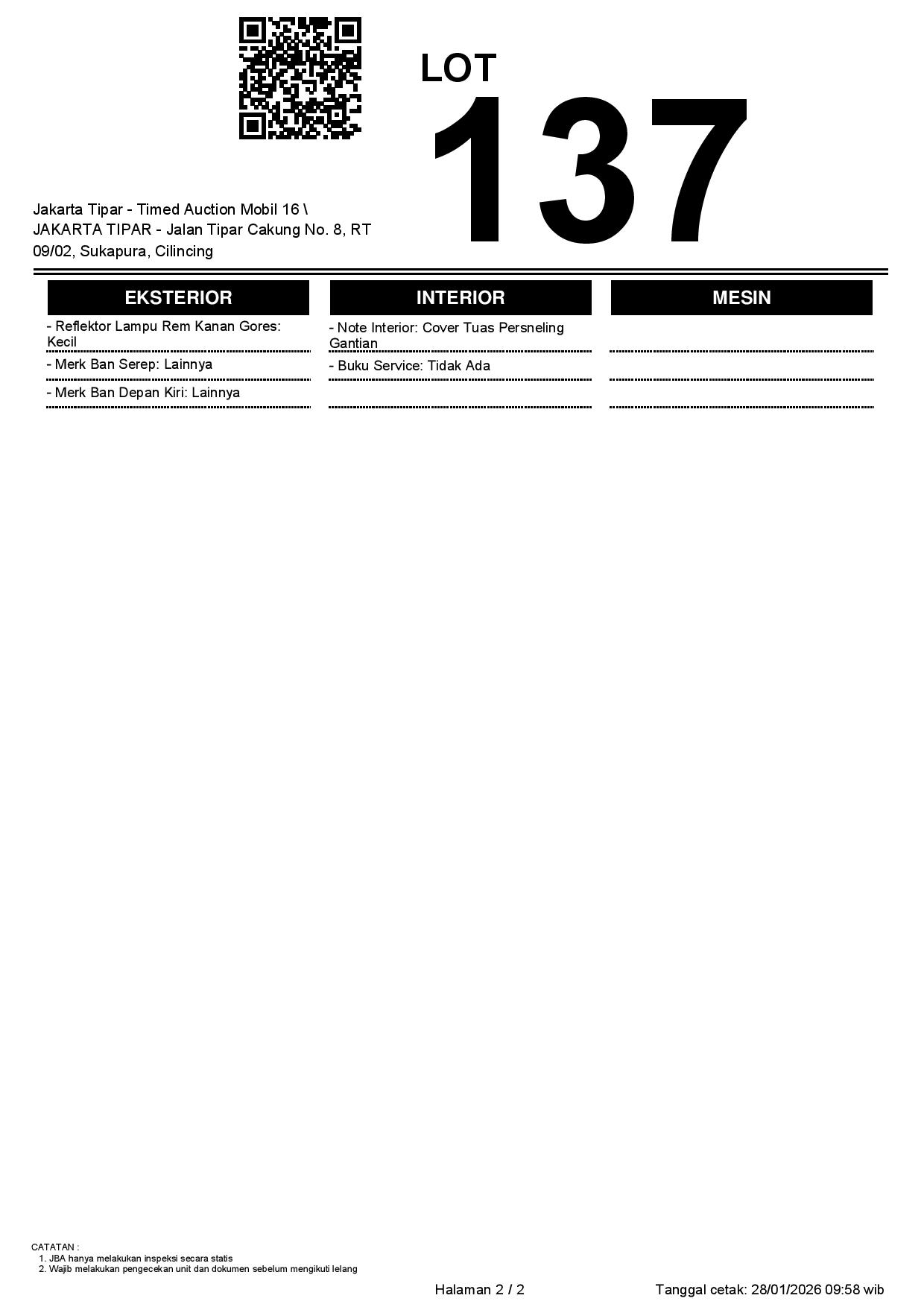 - Kondisi objek lelang dilelang apa adanya, baik kondisi fisik, mesin maupun legalitas kendaraan. Jika terdapat kekurangan/cacat baik yang terlihat maupun yang tidak terlihat, maka semua akan menjadi tanggung jawab/risiko Pemenang Lelang. Oleh karena itu, Pemenang Lelang melepaskan segala hak untuk menuntut dan/atau meminta ganti rugi atas hal tersebut kepada JBA.