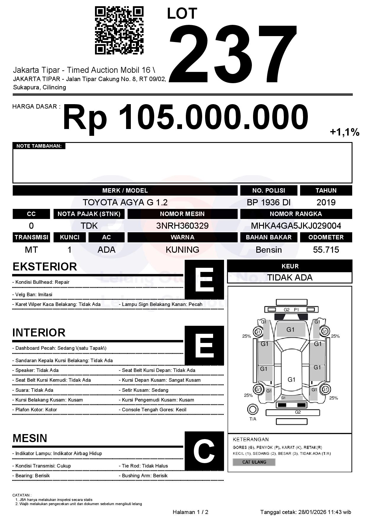 - Kondisi objek lelang dilelang apa adanya, baik kondisi fisik, mesin maupun legalitas kendaraan. Jika terdapat kekurangan/cacat baik yang terlihat maupun yang tidak terlihat, maka semua akan menjadi tanggung jawab/risiko Pemenang Lelang. Oleh karena itu, Pemenang Lelang melepaskan segala hak untuk menuntut dan/atau meminta ganti rugi atas hal tersebut kepada JBA.