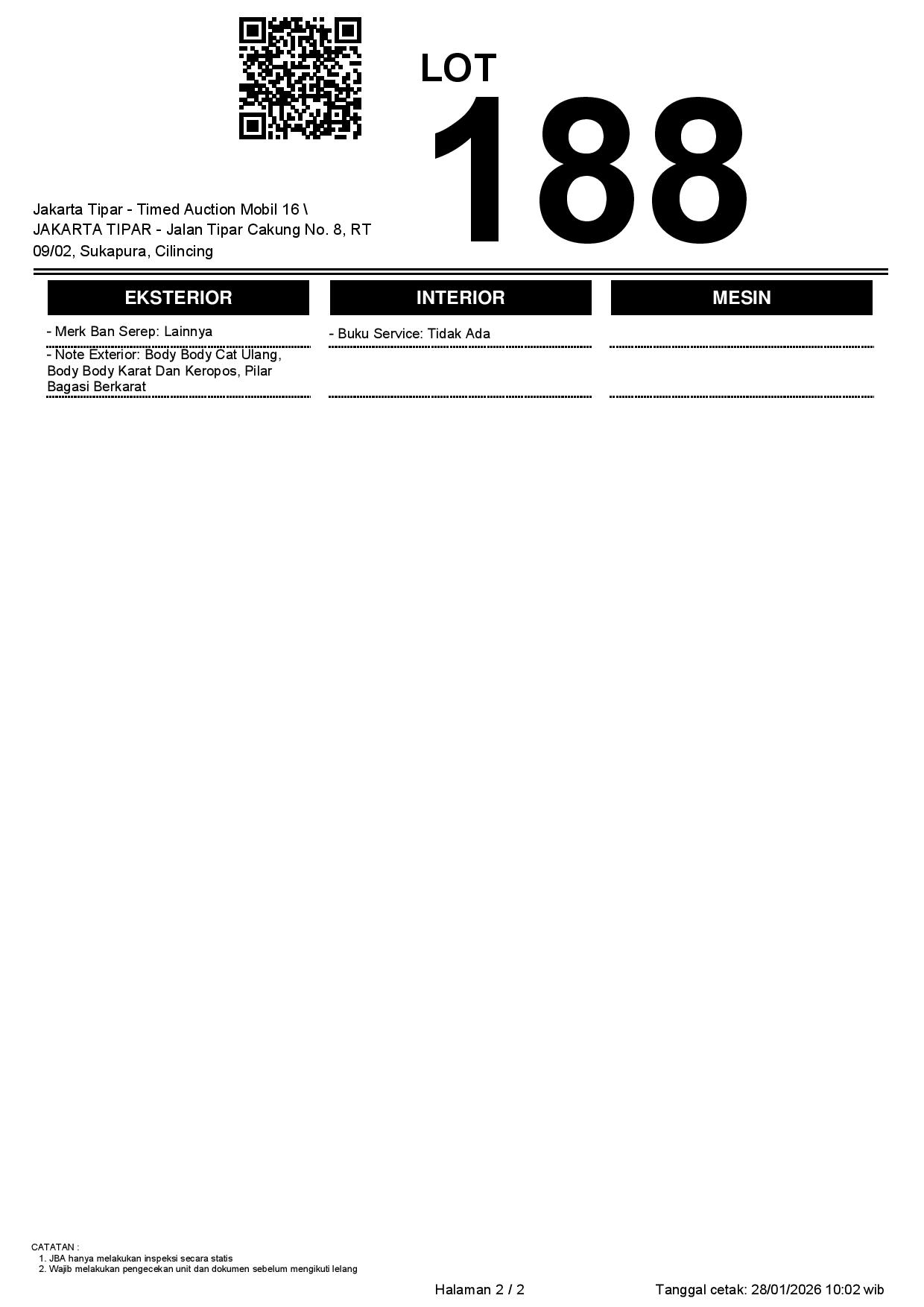 - Kondisi objek lelang dilelang apa adanya, baik kondisi fisik, mesin maupun legalitas kendaraan. Jika terdapat kekurangan/cacat baik yang terlihat maupun yang tidak terlihat, maka semua akan menjadi tanggung jawab/risiko Pemenang Lelang. Oleh karena itu, Pemenang Lelang melepaskan segala hak untuk menuntut dan/atau meminta ganti rugi atas hal tersebut kepada JBA.