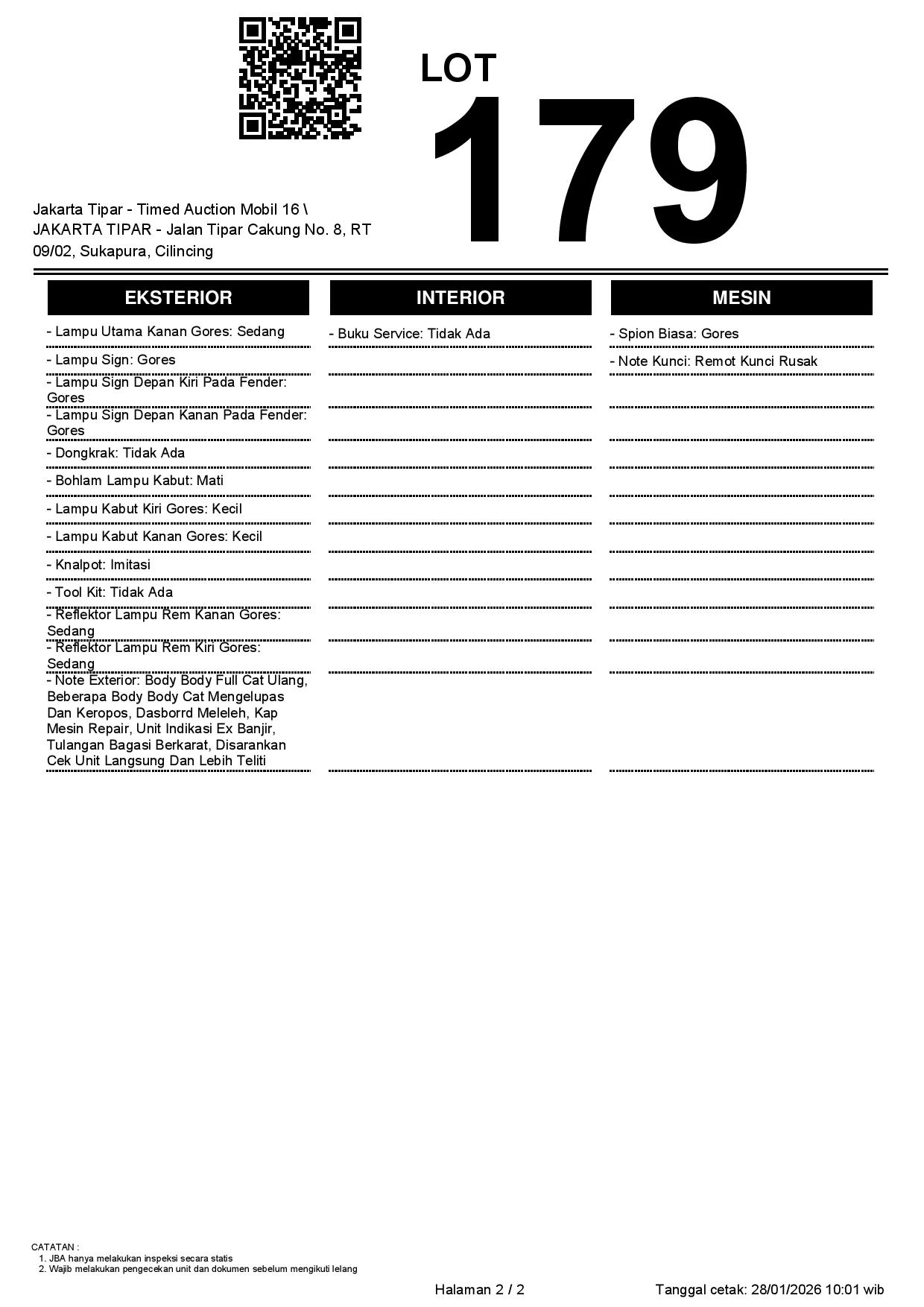 - Kondisi objek lelang dilelang apa adanya, baik kondisi fisik, mesin maupun legalitas kendaraan. Jika terdapat kekurangan/cacat baik yang terlihat maupun yang tidak terlihat, maka semua akan menjadi tanggung jawab/risiko Pemenang Lelang. Oleh karena itu, Pemenang Lelang melepaskan segala hak untuk menuntut dan/atau meminta ganti rugi atas hal tersebut kepada JBA.