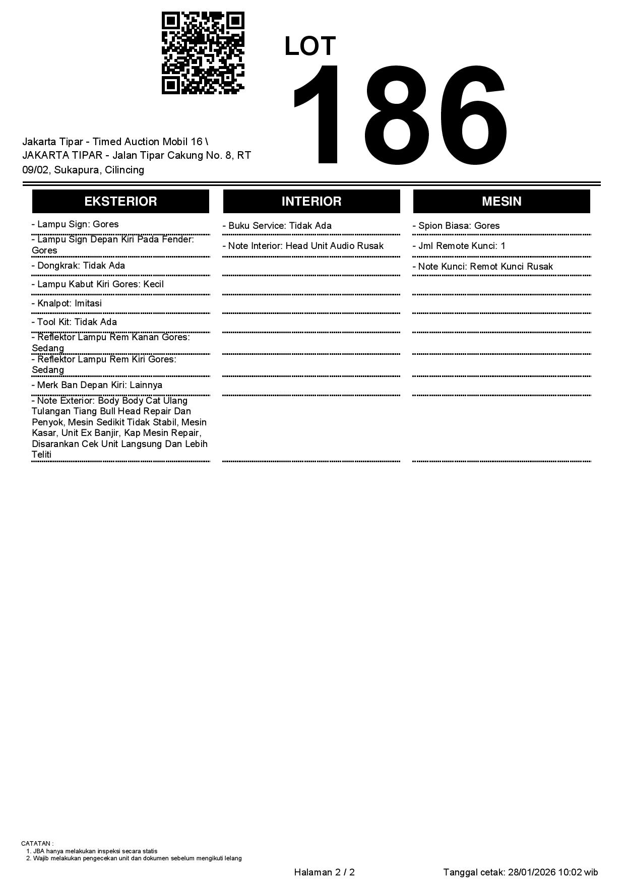 - Kondisi objek lelang dilelang apa adanya, baik kondisi fisik, mesin maupun legalitas kendaraan. Jika terdapat kekurangan/cacat baik yang terlihat maupun yang tidak terlihat, maka semua akan menjadi tanggung jawab/risiko Pemenang Lelang. Oleh karena itu, Pemenang Lelang melepaskan segala hak untuk menuntut dan/atau meminta ganti rugi atas hal tersebut kepada JBA.
