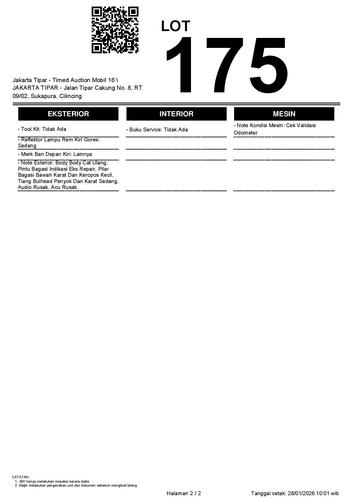 - Kondisi objek lelang dilelang apa adanya, baik kondisi fisik, mesin maupun legalitas kendaraan. Jika terdapat kekurangan/cacat baik yang terlihat maupun yang tidak terlihat, maka semua akan menjadi tanggung jawab/risiko Pemenang Lelang. Oleh karena itu, Pemenang Lelang melepaskan segala hak untuk menuntut dan/atau meminta ganti rugi atas hal tersebut kepada JBA.