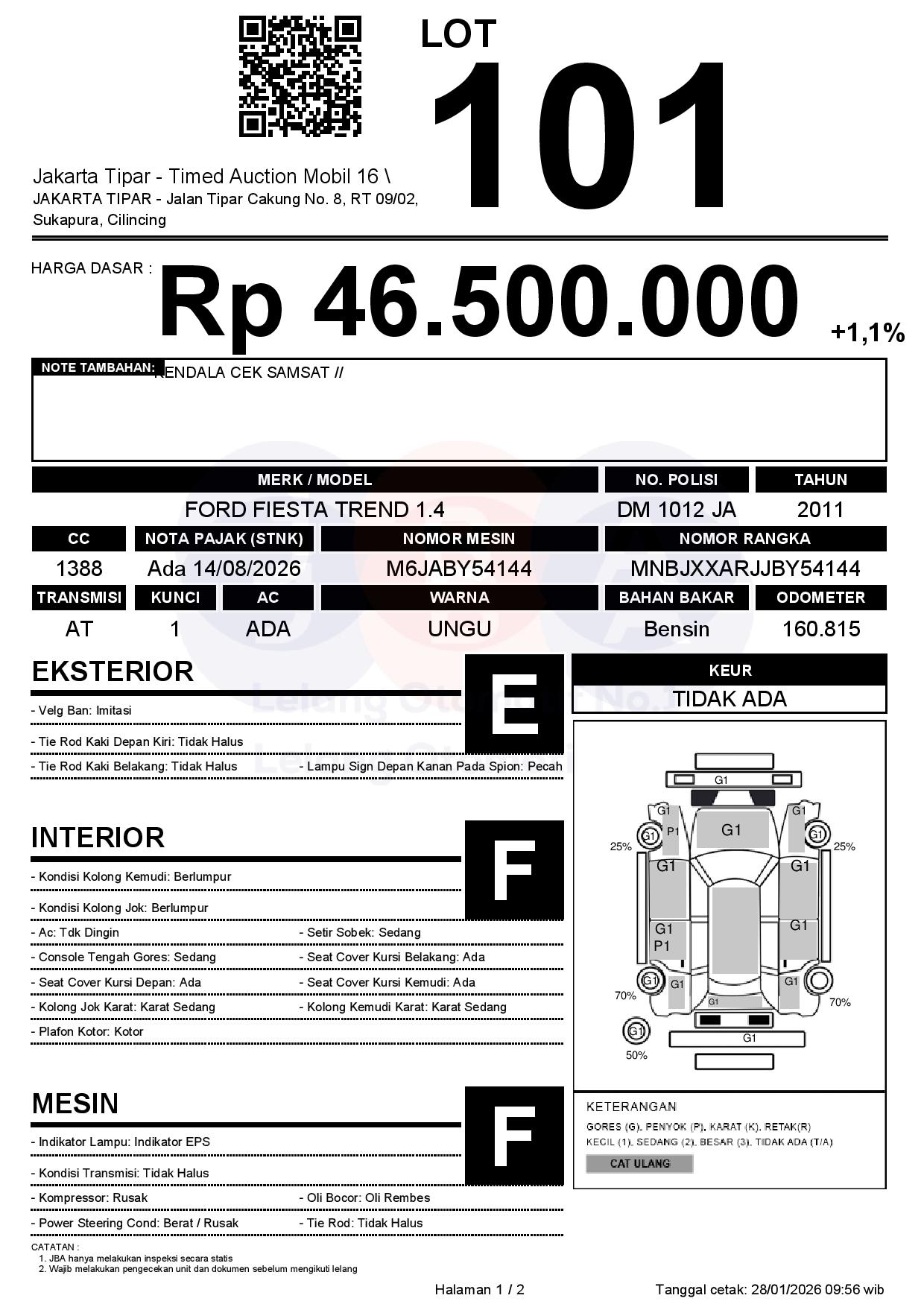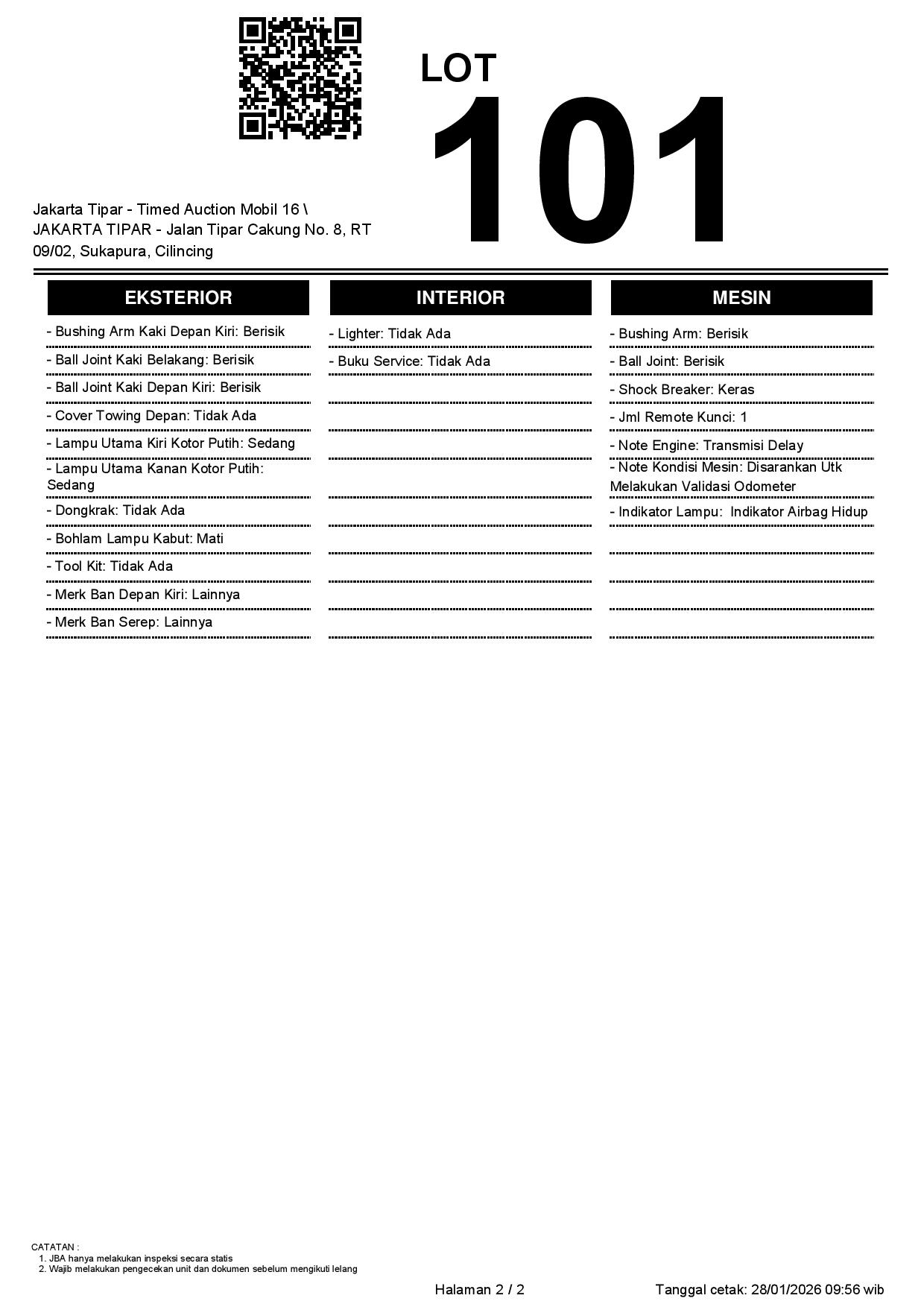 - Kondisi objek lelang dilelang apa adanya, baik kondisi fisik, mesin maupun legalitas kendaraan. Jika terdapat kekurangan/cacat baik yang terlihat maupun yang tidak terlihat, maka semua akan menjadi tanggung jawab/risiko Pemenang Lelang. Oleh karena itu, Pemenang Lelang melepaskan segala hak untuk menuntut dan/atau meminta ganti rugi atas hal tersebut kepada JBA.