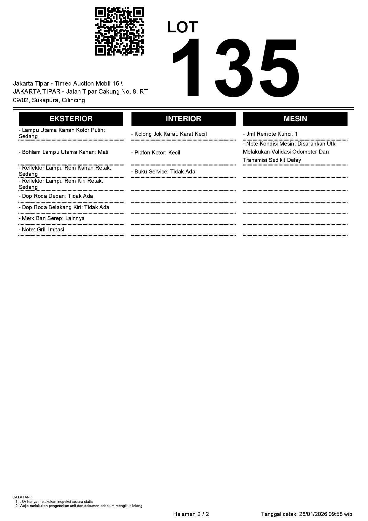 - Kondisi objek lelang dilelang apa adanya, baik kondisi fisik, mesin maupun legalitas kendaraan. Jika terdapat kekurangan/cacat baik yang terlihat maupun yang tidak terlihat, maka semua akan menjadi tanggung jawab/risiko Pemenang Lelang. Oleh karena itu, Pemenang Lelang melepaskan segala hak untuk menuntut dan/atau meminta ganti rugi atas hal tersebut kepada JBA.