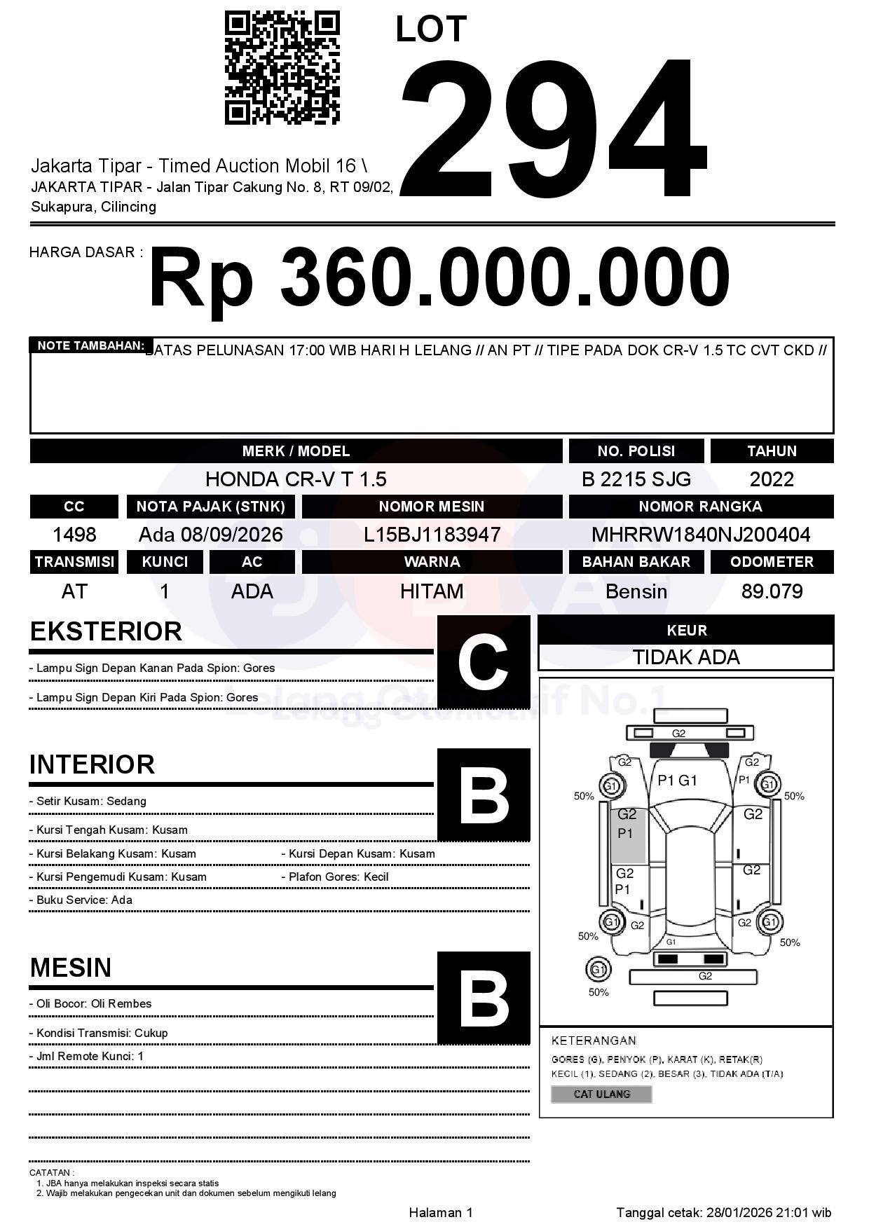 - Kondisi objek lelang dilelang apa adanya, baik kondisi fisik, mesin maupun legalitas kendaraan. Jika terdapat kekurangan/cacat baik yang terlihat maupun yang tidak terlihat, maka semua akan menjadi tanggung jawab/risiko Pemenang Lelang. Oleh karena itu, Pemenang Lelang melepaskan segala hak untuk menuntut dan/atau meminta ganti rugi atas hal tersebut kepada JBA.