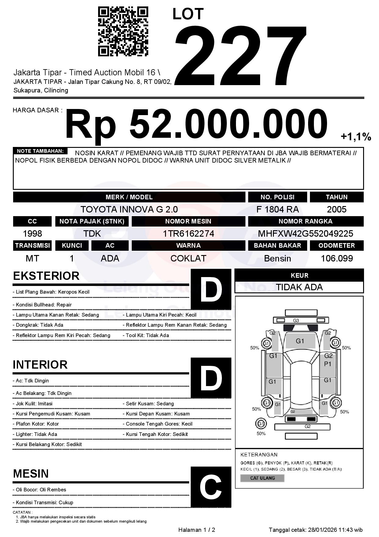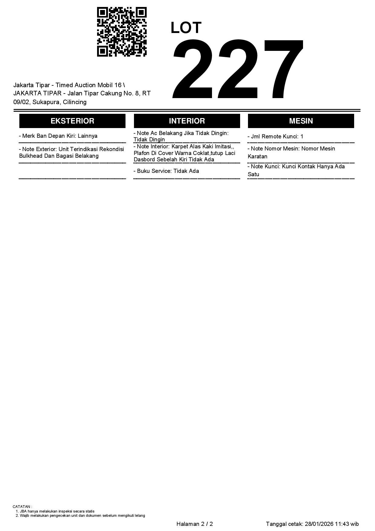 - Kondisi objek lelang dilelang apa adanya, baik kondisi fisik, mesin maupun legalitas kendaraan. Jika terdapat kekurangan/cacat baik yang terlihat maupun yang tidak terlihat, maka semua akan menjadi tanggung jawab/risiko Pemenang Lelang. Oleh karena itu, Pemenang Lelang melepaskan segala hak untuk menuntut dan/atau meminta ganti rugi atas hal tersebut kepada JBA.