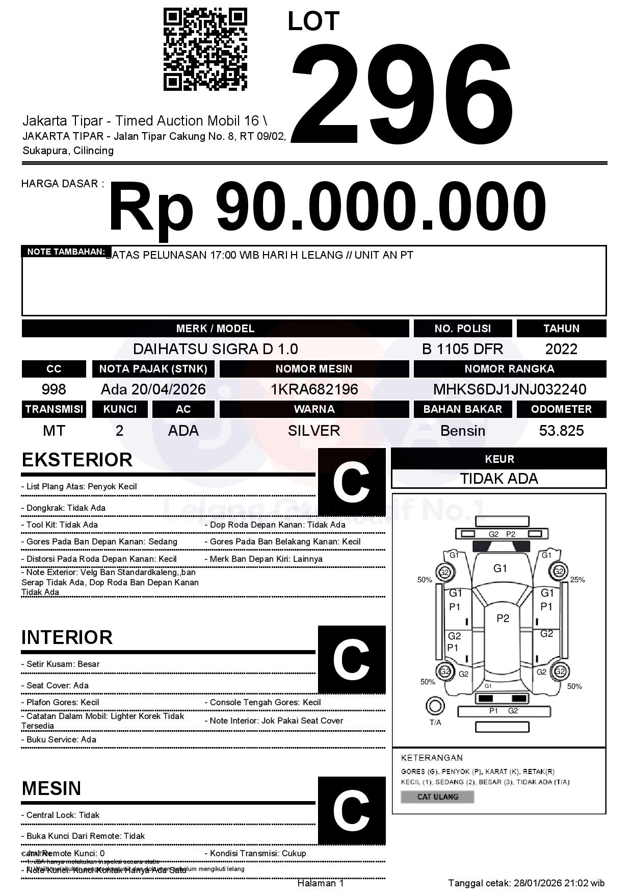 - Kondisi objek lelang dilelang apa adanya, baik kondisi fisik, mesin maupun legalitas kendaraan. Jika terdapat kekurangan/cacat baik yang terlihat maupun yang tidak terlihat, maka semua akan menjadi tanggung jawab/risiko Pemenang Lelang. Oleh karena itu, Pemenang Lelang melepaskan segala hak untuk menuntut dan/atau meminta ganti rugi atas hal tersebut kepada JBA.