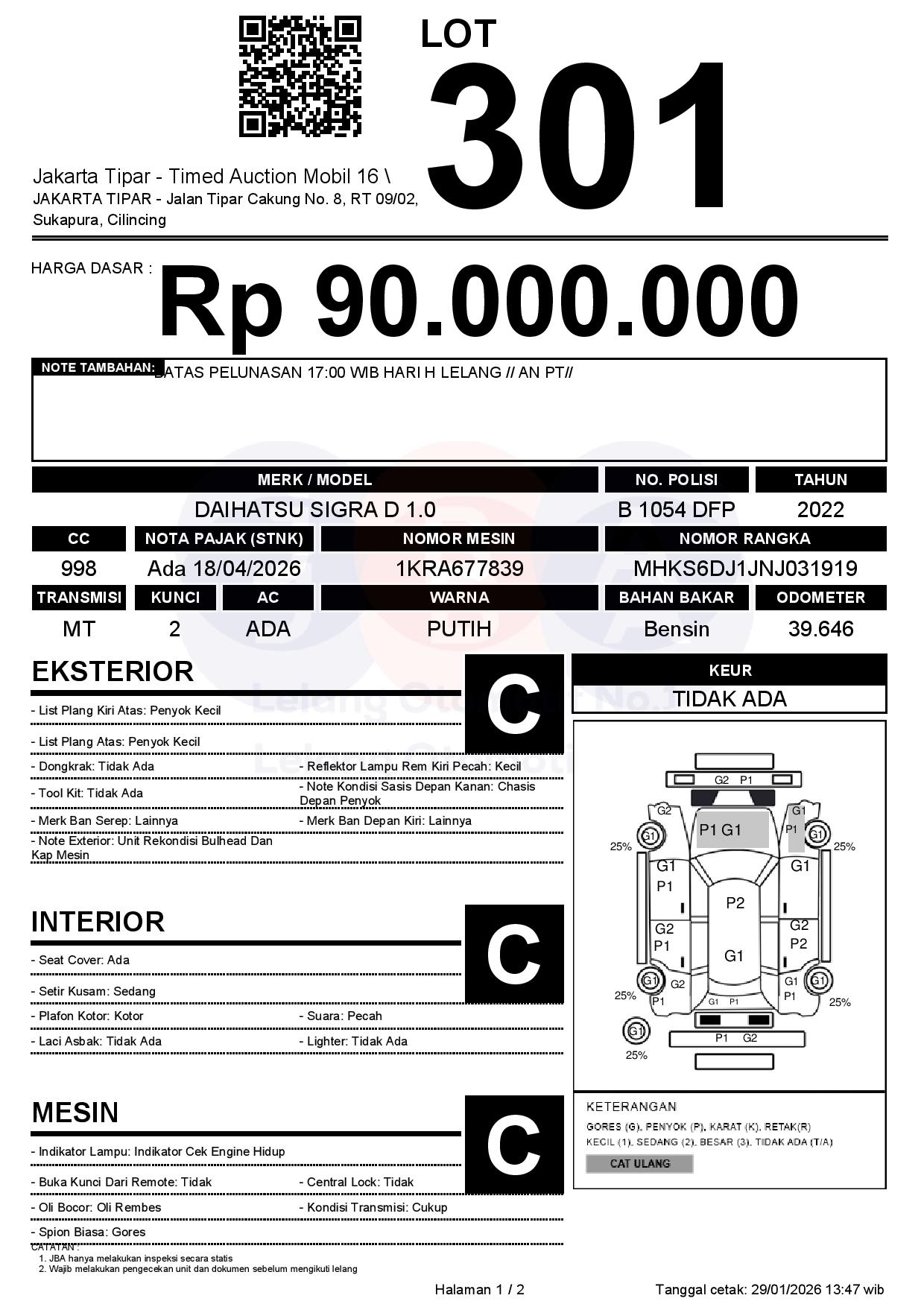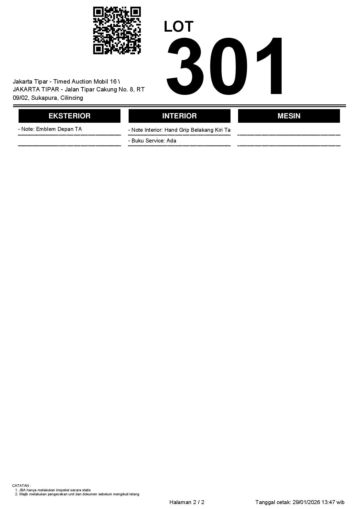- Kondisi objek lelang dilelang apa adanya, baik kondisi fisik, mesin maupun legalitas kendaraan. Jika terdapat kekurangan/cacat baik yang terlihat maupun yang tidak terlihat, maka semua akan menjadi tanggung jawab/risiko Pemenang Lelang. Oleh karena itu, Pemenang Lelang melepaskan segala hak untuk menuntut dan/atau meminta ganti rugi atas hal tersebut kepada JBA.