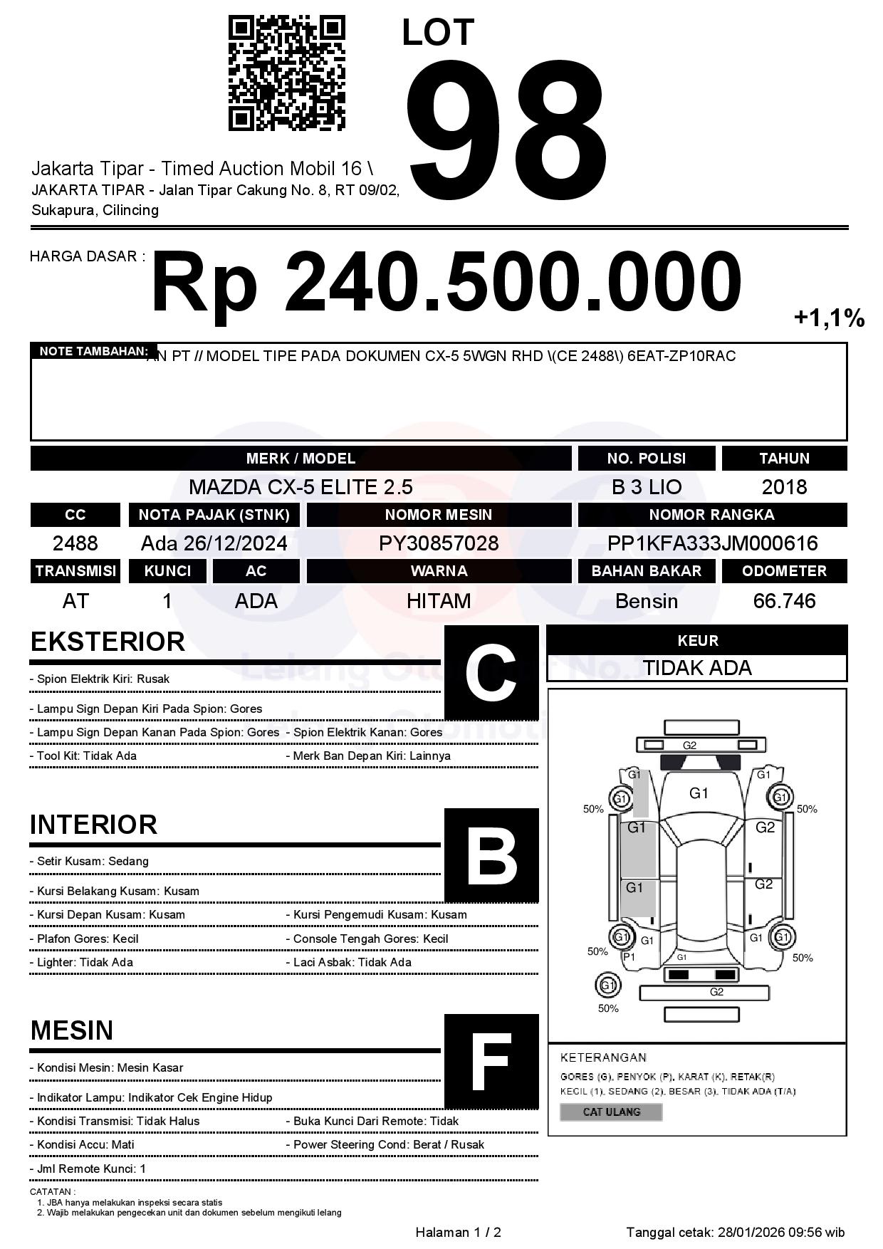 - Kondisi objek lelang dilelang apa adanya, baik kondisi fisik, mesin maupun legalitas kendaraan. Jika terdapat kekurangan/cacat baik yang terlihat maupun yang tidak terlihat, maka semua akan menjadi tanggung jawab/risiko Pemenang Lelang. Oleh karena itu, Pemenang Lelang melepaskan segala hak untuk menuntut dan/atau meminta ganti rugi atas hal tersebut kepada JBA.