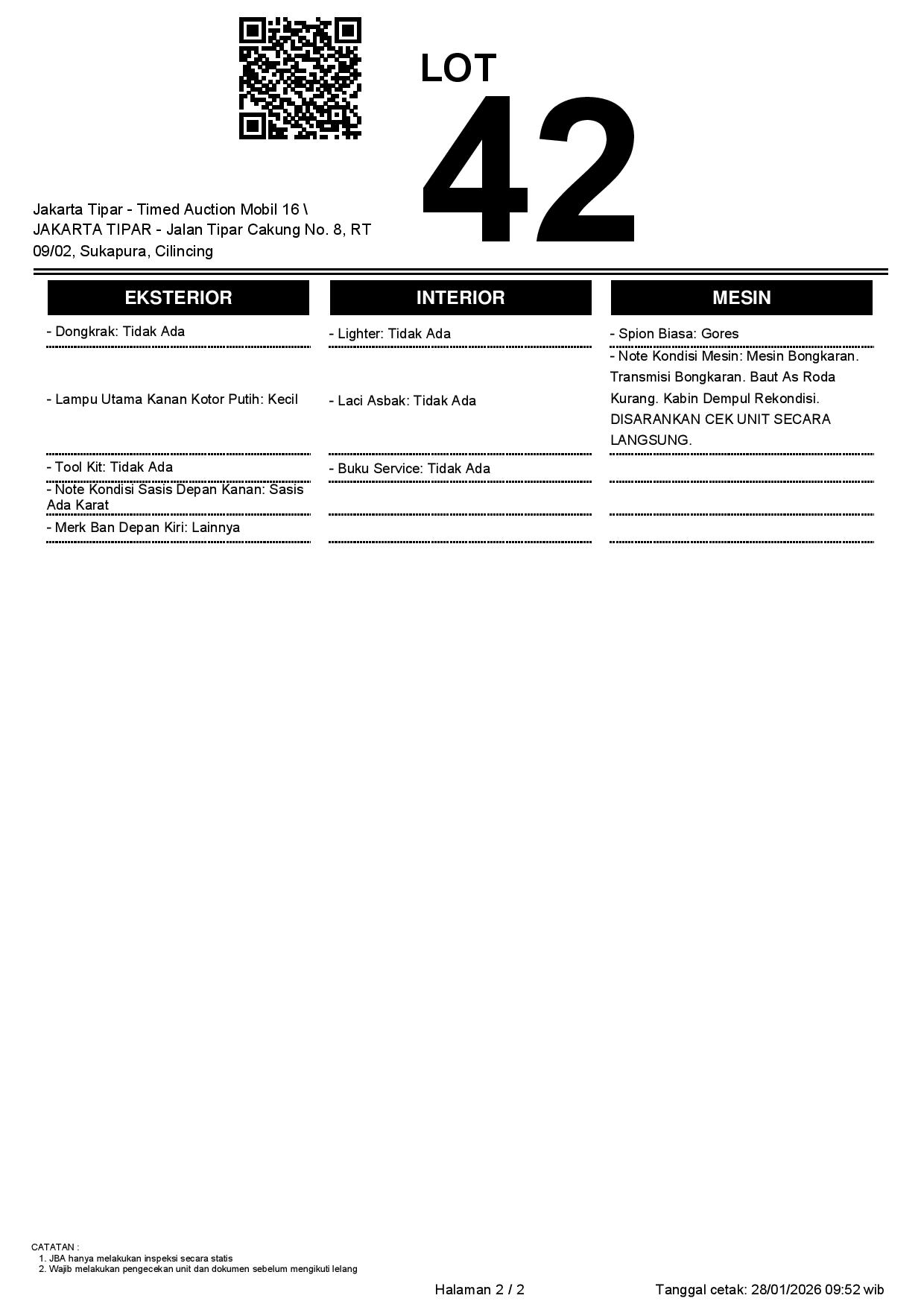 - Kondisi objek lelang dilelang apa adanya, baik kondisi fisik, mesin maupun legalitas kendaraan. Jika terdapat kekurangan/cacat baik yang terlihat maupun yang tidak terlihat, maka semua akan menjadi tanggung jawab/risiko Pemenang Lelang. Oleh karena itu, Pemenang Lelang melepaskan segala hak untuk menuntut dan/atau meminta ganti rugi atas hal tersebut kepada JBA.