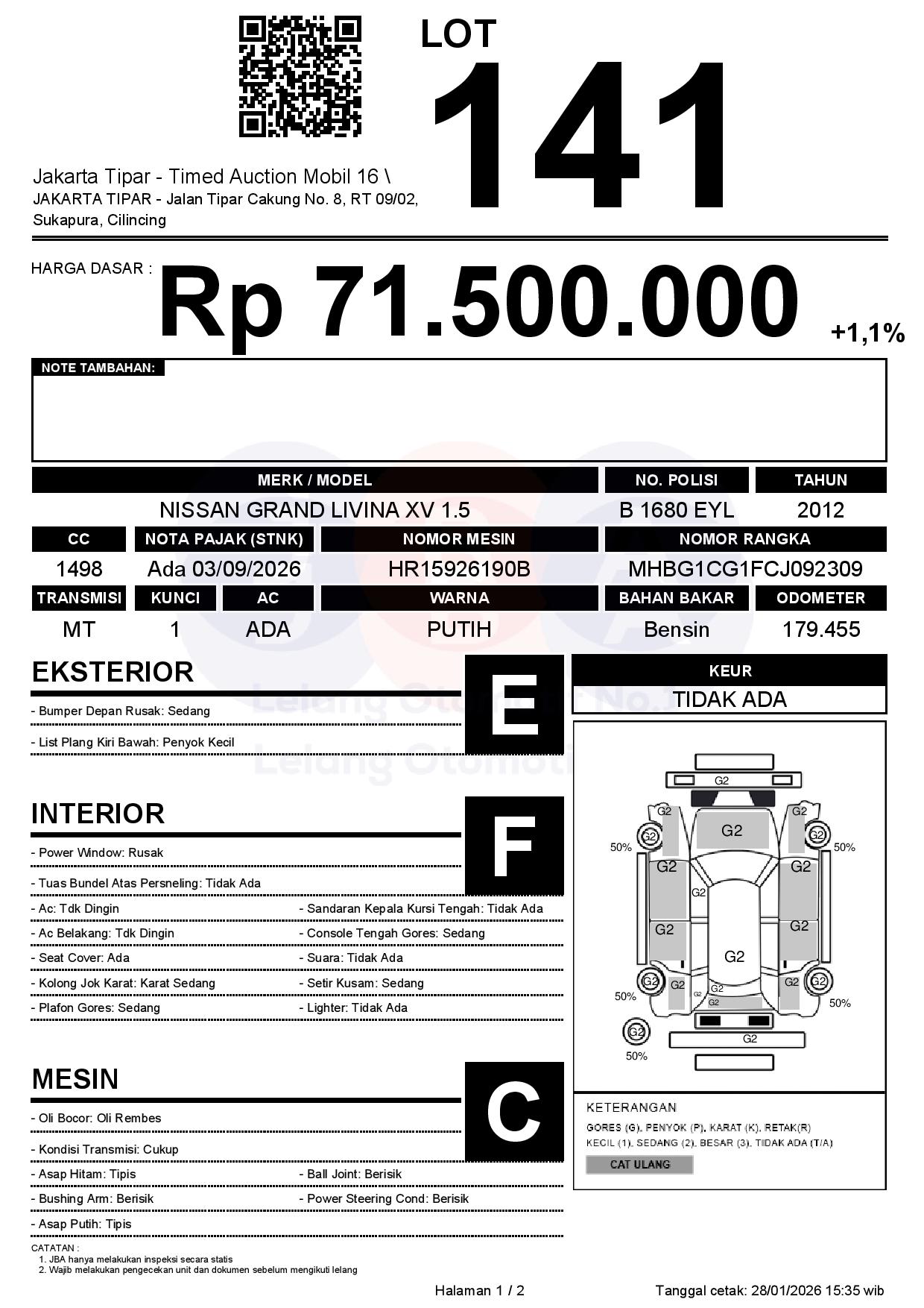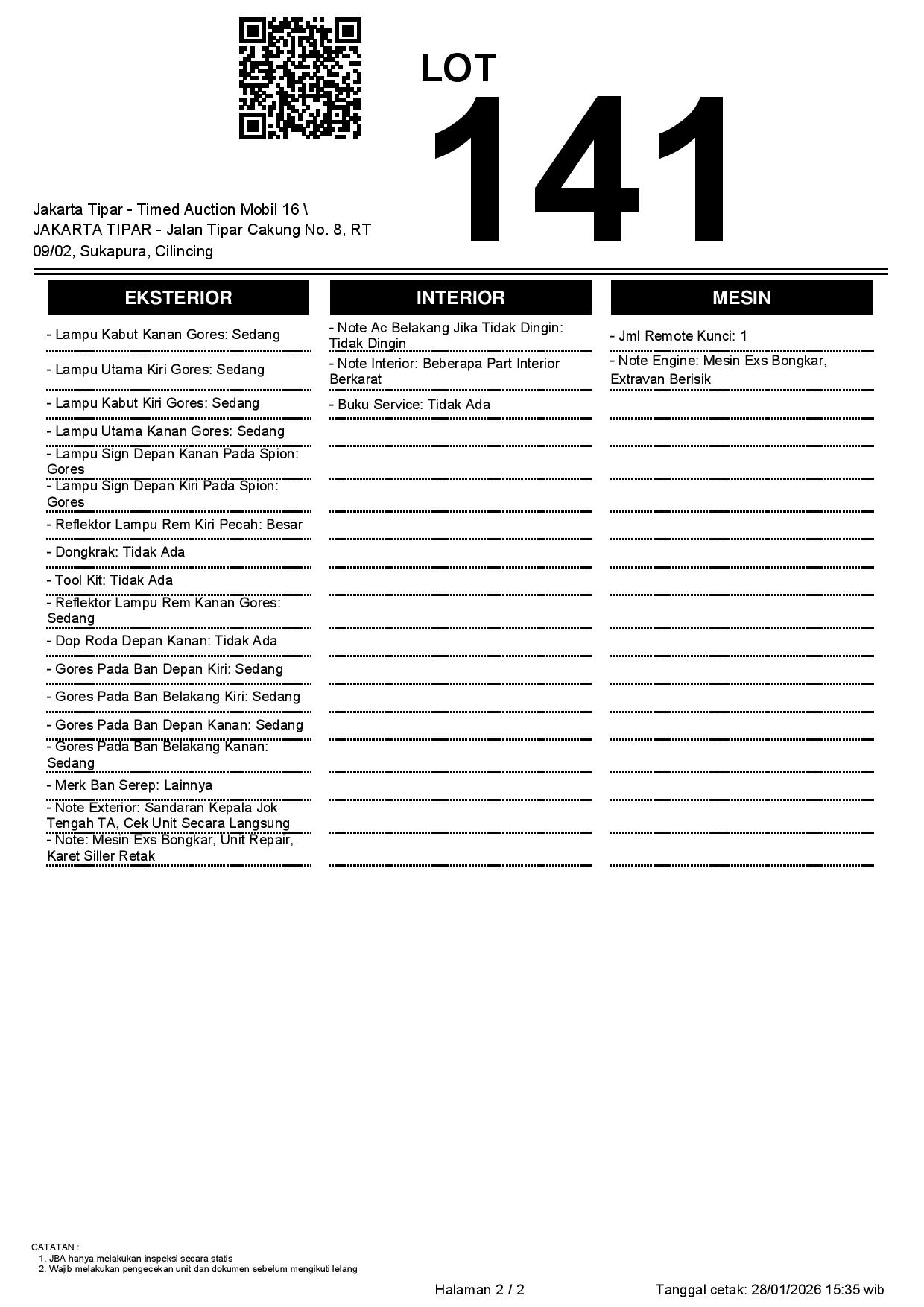- Kondisi objek lelang dilelang apa adanya, baik kondisi fisik, mesin maupun legalitas kendaraan. Jika terdapat kekurangan/cacat baik yang terlihat maupun yang tidak terlihat, maka semua akan menjadi tanggung jawab/risiko Pemenang Lelang. Oleh karena itu, Pemenang Lelang melepaskan segala hak untuk menuntut dan/atau meminta ganti rugi atas hal tersebut kepada JBA.