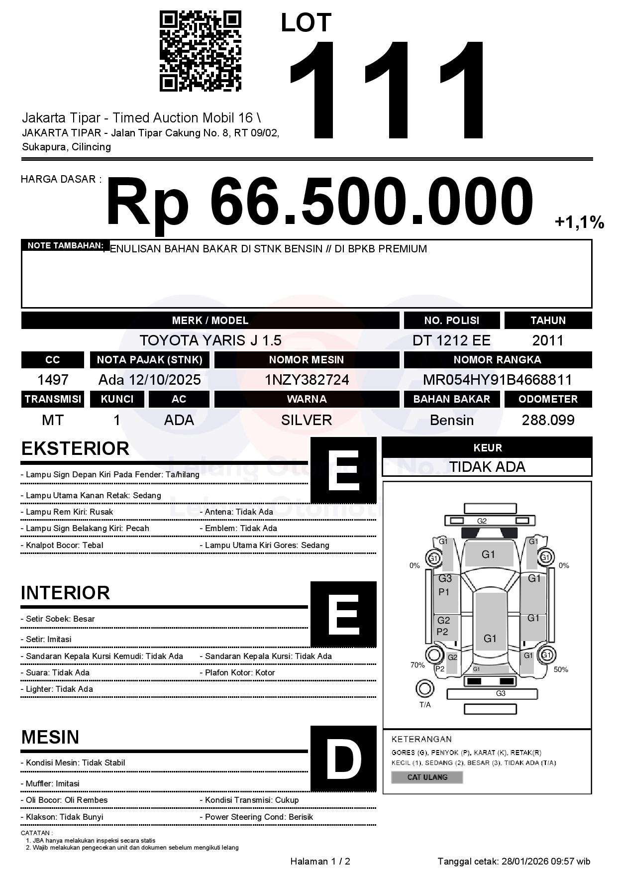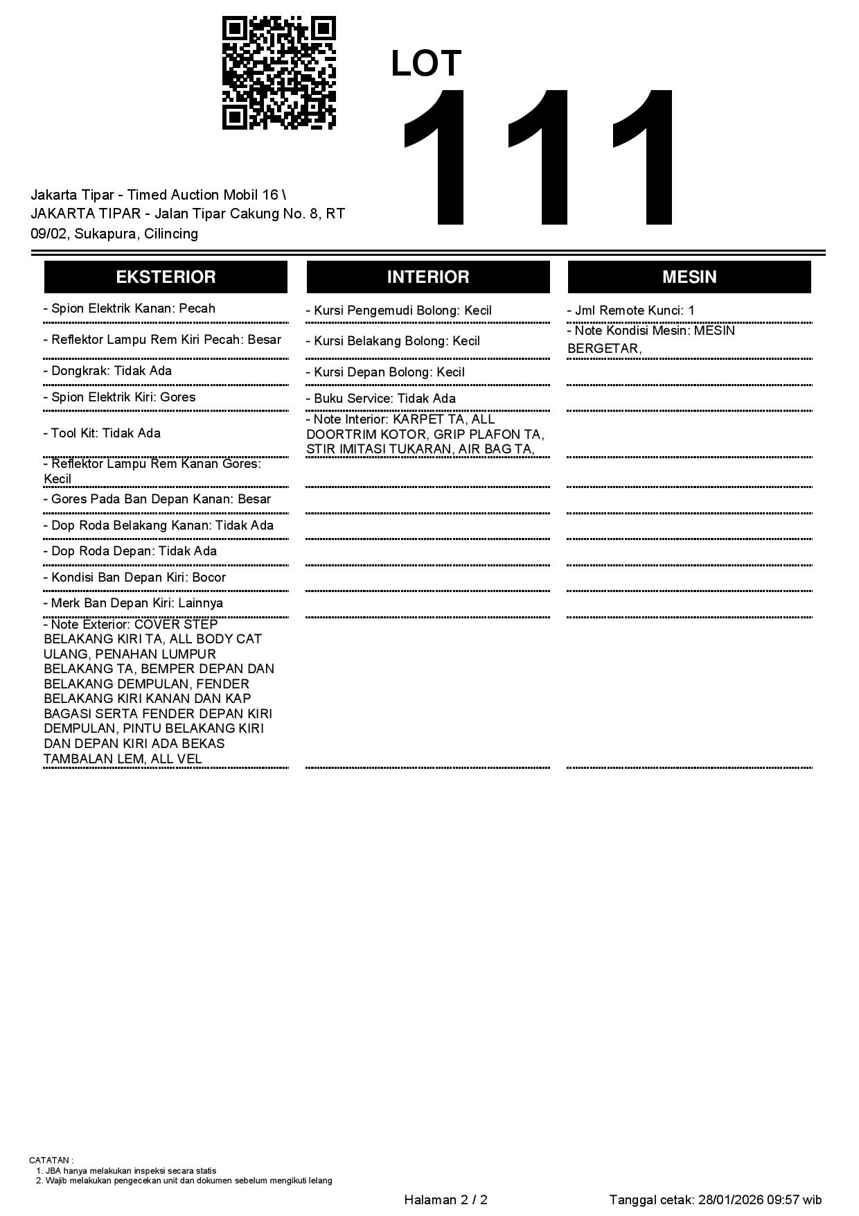 - Kondisi objek lelang dilelang apa adanya, baik kondisi fisik, mesin maupun legalitas kendaraan. Jika terdapat kekurangan/cacat baik yang terlihat maupun yang tidak terlihat, maka semua akan menjadi tanggung jawab/risiko Pemenang Lelang. Oleh karena itu, Pemenang Lelang melepaskan segala hak untuk menuntut dan/atau meminta ganti rugi atas hal tersebut kepada JBA.