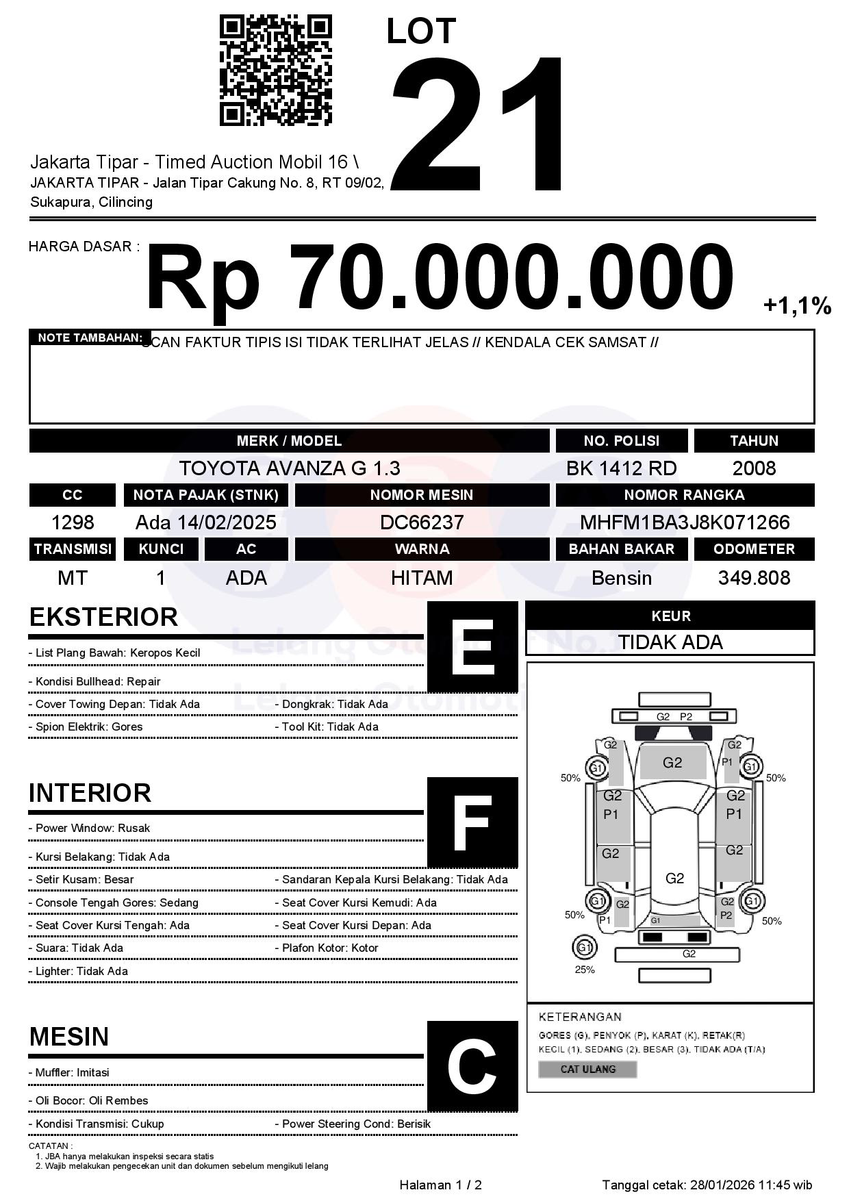 - Kondisi objek lelang dilelang apa adanya, baik kondisi fisik, mesin maupun legalitas kendaraan. Jika terdapat kekurangan/cacat baik yang terlihat maupun yang tidak terlihat, maka semua akan menjadi tanggung jawab/risiko Pemenang Lelang. Oleh karena itu, Pemenang Lelang melepaskan segala hak untuk menuntut dan/atau meminta ganti rugi atas hal tersebut kepada JBA.