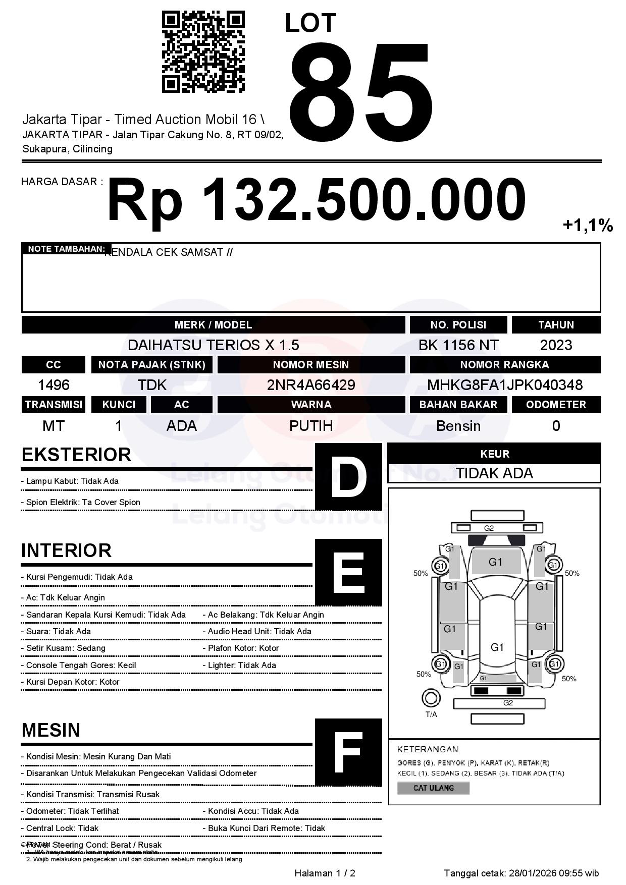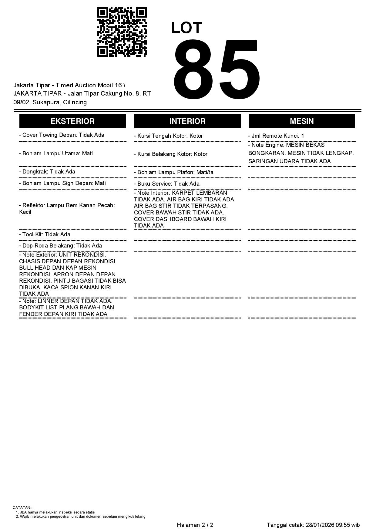 - Kondisi objek lelang dilelang apa adanya, baik kondisi fisik, mesin maupun legalitas kendaraan. Jika terdapat kekurangan/cacat baik yang terlihat maupun yang tidak terlihat, maka semua akan menjadi tanggung jawab/risiko Pemenang Lelang. Oleh karena itu, Pemenang Lelang melepaskan segala hak untuk menuntut dan/atau meminta ganti rugi atas hal tersebut kepada JBA.