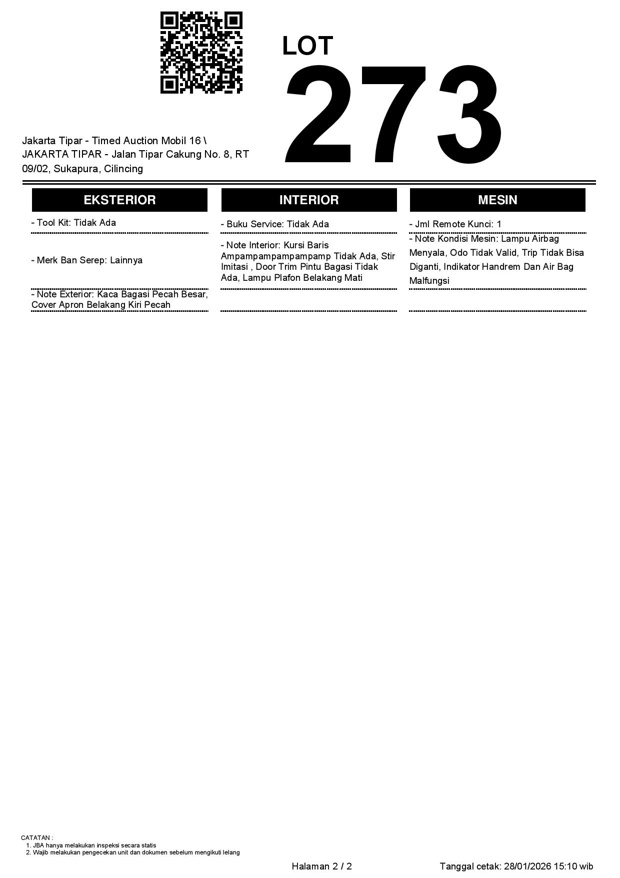 - Kondisi objek lelang dilelang apa adanya, baik kondisi fisik, mesin maupun legalitas kendaraan. Jika terdapat kekurangan/cacat baik yang terlihat maupun yang tidak terlihat, maka semua akan menjadi tanggung jawab/risiko Pemenang Lelang. Oleh karena itu, Pemenang Lelang melepaskan segala hak untuk menuntut dan/atau meminta ganti rugi atas hal tersebut kepada JBA.