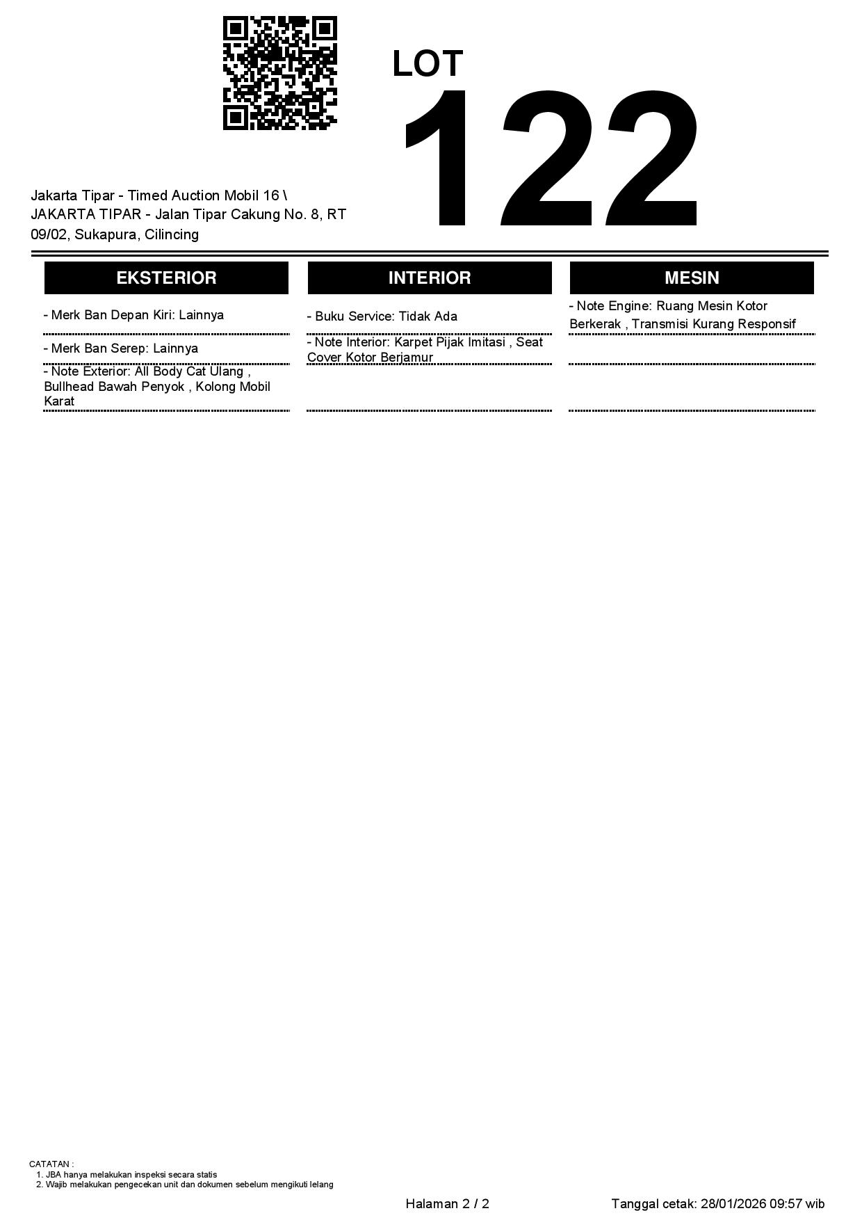 - Kondisi objek lelang dilelang apa adanya, baik kondisi fisik, mesin maupun legalitas kendaraan. Jika terdapat kekurangan/cacat baik yang terlihat maupun yang tidak terlihat, maka semua akan menjadi tanggung jawab/risiko Pemenang Lelang. Oleh karena itu, Pemenang Lelang melepaskan segala hak untuk menuntut dan/atau meminta ganti rugi atas hal tersebut kepada JBA.