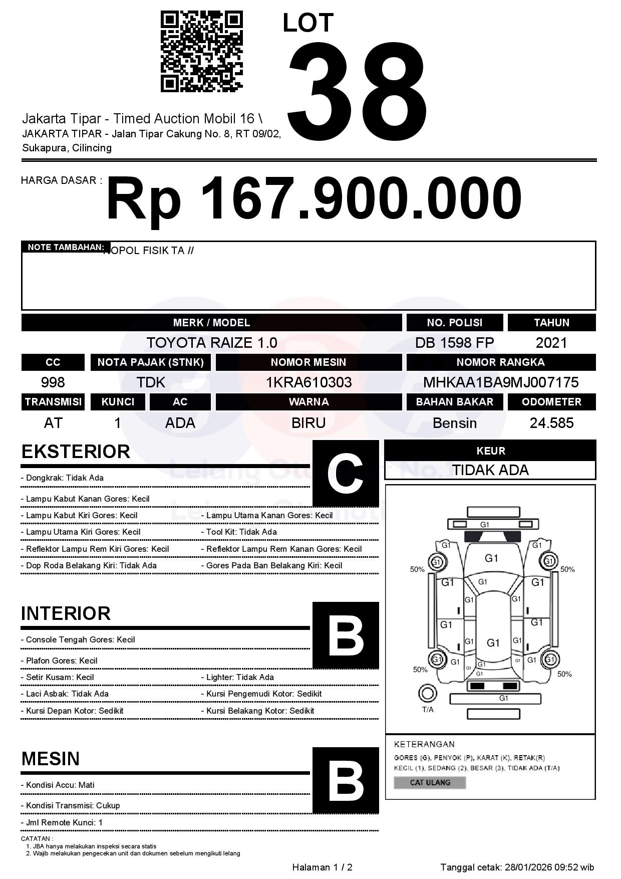 - Kondisi objek lelang dilelang apa adanya, baik kondisi fisik, mesin maupun legalitas kendaraan. Jika terdapat kekurangan/cacat baik yang terlihat maupun yang tidak terlihat, maka semua akan menjadi tanggung jawab/risiko Pemenang Lelang. Oleh karena itu, Pemenang Lelang melepaskan segala hak untuk menuntut dan/atau meminta ganti rugi atas hal tersebut kepada JBA.